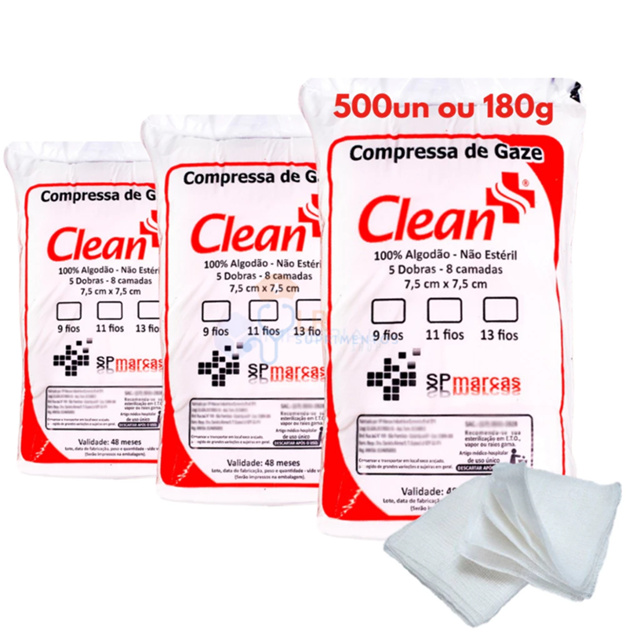 ENVIO FULL O MAIS RÁPIDO DO BRASIL !!!! 3x Pacotes Compressa De Gaze 9 Fios 500un (aproximada) ou 180g Marca: Clean Desenvolvida a partir de tecido hidrófilo, composição de 100% algodão - Tamanho: 7,5 x 7,5 - Cinco Dobras e Oito Camadas, 9 Fios por centímetro quadrado - Descartável e de uso único - 500 unid (aproximada) ou 180g Seu tecido é neutro, macio, altamente absorvente, inodoro e insípido. Suas 5 dobras e 8 camadas, são para o lado de dentro, não permitindo que hajam fios soltos. - Produto não estéril - São indicadas para absorção de líquidos ou secreções e curativos em geral, limpeza de pele, etc Garantia do vendedor: 7 dias