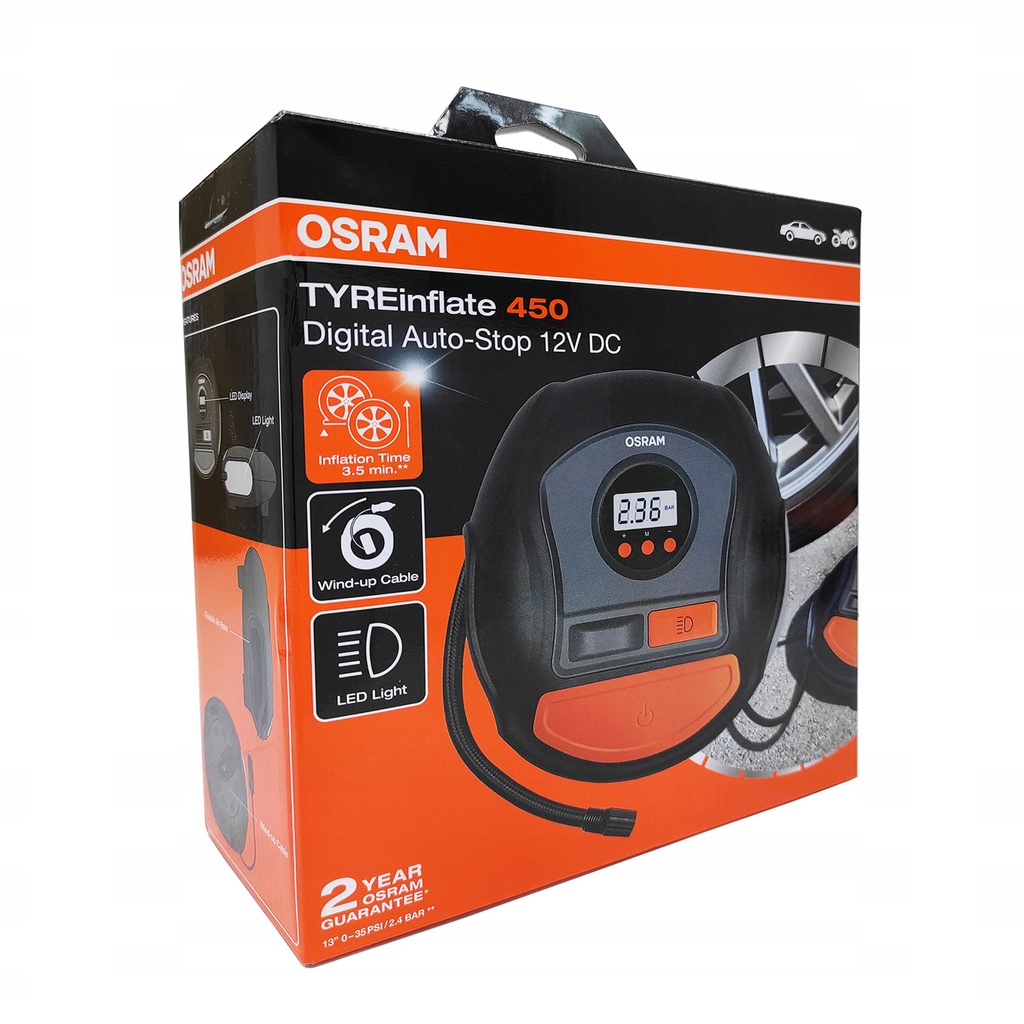 Compressor de Ar Automotivo Portátil Osram 12V 120W Digital O OSRAM Tyreinflate 450 pode encher um pneu a partir do furo em 3,5 minutos**. Vem com recurso de parada automática para obter com precisão a pressão desejada para o seu pneu. Inclui um display digital retroiluminado e luz LED branca para iluminação ideal na escuridão. Vem com adaptador de três peças para pneus de bicicleta, bolas e outros insufláveis. ESPECIFICAÇÕES TÉCNICAS: - Marca: Osram; - Modelo: TYREinflate 450; - Precisão (barra): ±0.1 bar; - Taxa de fluxo (l/min): tbc; - Tempo de Inflação: 3.5min; - Comprimento do cabo de alimentação: 3.0m; - Tempo de carga (h): N/A; - Tamanho do Display: 40x35mm; - Unidades de medida: PSI, kPa, bar; - Comprimento de mangueira de ar: 50cm; - Pressão Máxima: 5.5bar; - Tensão: 12v; - Fonte de energia: 12 v Plugue Fundido; - Potência: 120w; - Dimensões: 180mm X 88mm X 197mm; - Recomendado para usar com: carro, Van pequena ; - Nível de ruído (dB): 90 dB; - Tipo de Exibição: digital; - Fusível: 10 A; - Código do Produto: OTI450; CONTEÚDO DA EMBALAGEM: - 01 Compressor de Ar Automotivo Portátil Osram. IMPORTANTE: - Garantia: 2 anos contra qualquer defeito de fabricação; - Todos os nossos produtos são originais de fábrica; - Imagens Meramente Ilustrativas; - Nós da Fast Buy Brasil não nos responsabilizamos pelo mau uso do produto.