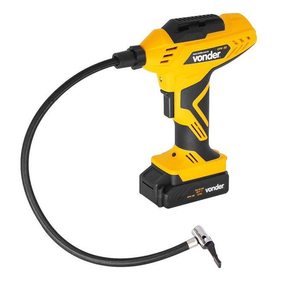 Compressor De Ar A Bateria Tipo Pistola 20V Vonder Cpv20 O Compressor de Ar a Bateria Tipo Pistola 20V CPV20 Vonder e compacto, portátil e pronto para uso facilitando muito aquelas horas que precisamos encher um objeto. Como e a bateria pode ser levado para qualquer lugar, tornando o trabalho muito mais rápido e pratico. Possui LED para melhor visibilidade e visor/indicador de pressão digital. Indicado para encher balões, bolas, boias, pneus de carros e bicicletas. Devido o compressor tipo pistola CPV 20 VONDER nao ser calibrado, sempre utilize medidores de pressão para verificar a pressão dos pneus. Detalhes Técnicos: * Bateria:?20 V - 2,0 Ah - ions de litio * Capacidade de produção de ar do compressor de ar (deslocamento teórico):?2,8 pcm (pe3/min) * Pressão máxima de trabalho do compressor de ar (PSI):?150 lbf/pol2 * Tensão do carregador de bateria:?100 V~ - 240 V~ - Bivolt automático * Frequência:?50 Hz/60 Hz * Segue norma:?ABNT NBR IEC 60745-1 * Massa aproximada(Kg):?1,07 kg * Nível de ruido (dB):?83 * Dimensões (C x L x A):?180 mm x 77 mm x 255 mm * Nível de vibração (m/s2):?2,4 m/s2 * Incerteza k (m/s2):?1,5 m/s2 * Garantia - E (CDC):?Garantia legal: 90 dias + Garantia contratual: 9 meses CONTEUDO DA EMBALAGEM:? * 1 Compressor tipo pistola * 1 maleta * 1 bateria de 20 V * 1 carregador bivolt automático * 1 bico adaptador para bolas * 1 bico adaptador para uso geral * 1 adaptador para válvulas * 1 mangueira flexível com bico