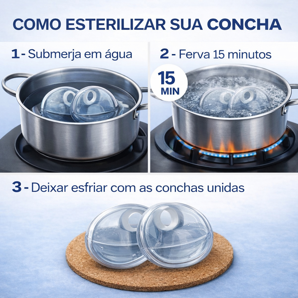 Concha de Amamentação – Protege, Alivia e Facilita a Amamentação A concha de amamentação é uma grande aliada das mamães que desejam amamentar com conforto e segurança! 💗 Feita com material hipoalergênico, leve e anatômico, ela se adapta perfeitamente ao seio, protegendo os mamilos sensíveis e evitando o atrito com o sutiã. CONTEÚDO: - 02 conchas coletoras CARACTERÍSTICAS DO PRODUTO: - Polipropileno - BPA FREE - Livre Bisfenóis BENEFÍCIOS: - Mantém os mamilos arejados, auxiliando na prevenção e cicatrização das rachaduras; - Evita o atrito com o sutiã, sem umedecê-lo; - Deixa os mamilos livres, na posição normal, sem amassá-los; - O leite que vaza fica dentro das Conchas, evitando o desconforto de molhar a roupa. Podendo esse leite, quando coletado fresco, durante a mamada e com instruções de higienização adequada, ser armazenado para uso ou doação. - Deixa os mamilos mais salientes, facilitando "a pega" do bebê à mama; - É prático, higiênico e esterilizável. INSTRUÇÕES DE USO: Siga as instruções de esterilização abaixo antes de usar. Inicie o uso logo após o parto. - Em casos de mamilos planos ou invertidos, use a partir do 8° mês de gestação; - Acomode diretamente sobre as mamas com o furo de ventilação para cima, de modo que os mamilos fiquem livremente posicionados dentro dos orifícios centrais; - Use diariamente, retirando-as quando for dormir ou amamentar; - Siga atentamente as orientações de seu médico. DICAS PARA HIGIENIZAÇÃO DO PRODUTO: - Antes de reutilizar , lave as partes das conchas separadamente, com sabão e água em abundância, retirando o acúmulo de leite do interior, para evitar a proliferação de bactérias. - Para esterilizar: Ferva durante 15 minutos, mantendo as partes unidas até voltarem à temperatura normal.