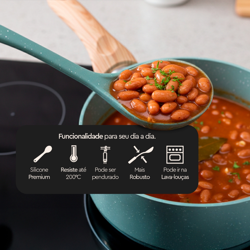 Seja Bem-Vindo(a) à Mimorada! Conchas são utensílios indispensáveis em qualquer cozinha. Para fazer bonito à mesa, com um serviço de qualidade e sofisticação, a Concha de Silicone da Linha Flex/Brinox é a escolha certa. Além de trazer praticidade no dia a dia da cozinha, não causa danos às superfícies das panelas, em especial naquelas com revestimento antiaderente ou de cerâmica. Desenvolvida especialmente para servir caldos, sopas e feijão, a Concha Flex conta com design contemporâneo, podendo ser pendurada para compor o ambiente ou deixar sempre à mão. Com 28 cm de comprimento e estrutura em silicone, essa Concha Flex é na cor Verde com grânulos Brancos, levando sensação de harmonia, bem-estar e natureza à decoração, seja ela moderna ou rústica. Testada e aprovada pelos cozinheiros mais exigentes, a Concha de Silicone da Linha Flex/Brinox é fácil de limpar e pode até ser levada à lava-louças, facilitando a rotina. Para deixar sua casa ainda mais bonita e completa, aproveite para adquirir as panelas da Linha Botanika, que são da mesma tonalidade dos utensílios da Linha Flex, que ainda inclui itens como espátula, colher, pincel e pegadores, entre outros. A Concha de Silicone Linha Flex faz parte do conjunto de utilidades domésticas da Brinox. São itens para o dia a dia e para ocasiões especiais. Tudo fabricado com os mais rigorosos padrões de qualidade técnica e responsabilidade ambiental. Os produtos Brinox agregam tecnologia, sofisticação e sustentabilidade.