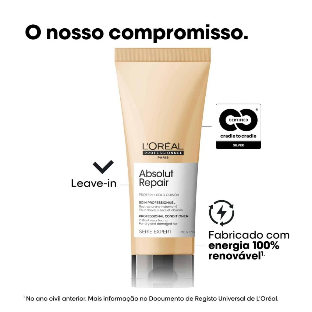 CONDICIONADOR ABSOLUT REPAIR LORÉAL PROFESSIONNEL SERIE EXPERT 200ML Infundido com GOLD QUINOA + PROTEÍNA, a fórmula profissional do condicionador é o tratamento perfeito para reestruturar imediatamente os cabelos danificados. Sua fórmula cremosa nutre a fibra capilar, deixando-a com um toque leve e suave. QUINOA + PROTEÍNA: Em sua composição, além de vitaminas E e do complexo B, conta com a proteína completa, que auxilia na profunda reestruturação da fibra danificada enquanto criam um filme que confere força e proteção aos fios, prevenindo danos futuros. PROTEÍNA HIDROLISADA DO TRIGO: Sua função é ajudar a controlar a perda de hidratação dos fios, conferindo alta maciez, toque sedoso, além de criar um filme protetor que mantem as cutículas seladas, retendo assim as propriedades restauradoras dentro da fibra capilar. CO-EMULSÃO: Uma nova geração de moléculas, 50x menores do que as tradicionais. Os ativos penetram mais fundo na fibra atuando especialmente nas áreas mais danificadas. O resultado é um filme fino e homogêneo em toda fibra capilar, que deixa os cabelos com toque leve e suave.