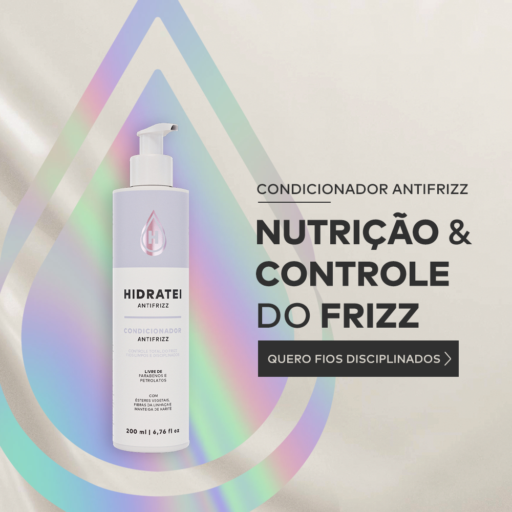 Nutre as camadas mais profundas e devolve a hidratação natural dos fios, controla o frizz, fecha as cutículas dos fios, resultado de um cabelo alinhado, sem perder a sedosidade e o movimento. A etapa de condicionar os fios é indispensável para os cabelos indisciplinados, isso porque é nessa etapa que as cutículas capilares são fechadas. O Condicionador Antifrizz Hidratei, nutre as camadas mais profundas e devolve a hidratação natural dos fios. O resultado? Um cabelo alinhado, sem perder a sedosidade e o movimento. Benefícios - Ação Antifrizz - Hidratação - Controle do frizz - Alinhamento dos fios - Redução da carga eletrostática do cabelo Modo de Uso - Com os fios úmidos e limpos, espalhe o Condicionador Antifrizz Hidratei, começando pelas pontas, deslizando pelo comprimento, desembaraçando os fios. Deixe agir por alguns minutos e enxágue. Para maiores resultados, use a linha completa Antifrizz Hidratei. Ingredientes Ativos - ÉSTERES VEGETAIS: Derivados do óleo de rícino, os ésteres ativam o brilho intenso ao interagirem com as proteínas da fibra capilar, realçando a cor dos fios. - COMPLEXO DE FIBRAS DA LINHAÇA: Ativo biotecnológico, com fibras solúveis da Linhaça, ricas em proteínas e biopolimeros. Um ativo antifrizz poderoso, que alinha os fios desde o primeiro uso. - MANTEIGA DE KARITÉ: É um ativo altamente nutritivo, revitalizante, eficaz e totalmente natural. Proporciona brilho, flexibilidade e maciez. Sua propriedade umectante auxilia na retenção da umidade, proporcionando grande hidratação dos cabelos. Forte aliada na recuperação dos cabelos secos, fracos e quebradiços.