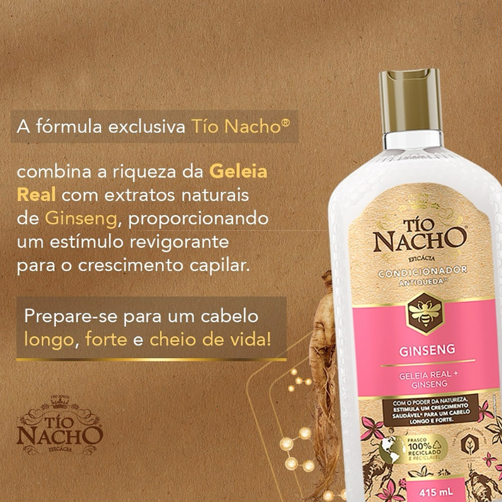 CONDICIONADOR ANTIQUEDA GINSENG TIO NACHO 415ML A linha Tío Nacho Ginseng promove um crescimento mais saudável dos fios. Sua fórmula, com Geleia Real e Extrato de Ginseng, proporciona cabelos longos mais fortes, resistentes e com brilho. BENEFÍCIOS Fórmula antiqueda*. Crescimento saudável dos fios. Cabelos longos mais fortes e com brilho. Promove resultados eficazes desde o primeiro uso. Desenvolvido com Geleia Real e ingredientes hidratantes de origem natural. Fórmula antiqueda*. MODO DE USO: Após lavar os cabelos com o Shampoo da linha, aplique o Condicionador sobre o cabelo ainda molhado, distribuindo generosamente no comprimento dos fios até as pontas. Deixe agir por alguns minutos. Enxágue bem. Dica: Para melhores resultados, utilize a linha completa Tío Nacho Ginseng. INGREDIENTES PRINCIPAIS: - Geleia Real Substância produzida por abelhas que contém proteínas (como a roialactina, potente na nutrição natural dos fios do cabelo), além de açúcar, lipídeos, vitaminas, aminoácidos, ácido fólico e minerais. - Extrato de Ginseng Possui ação revitalizante e ajuda a manter o couro cabeludo saudável. ADVERTÊNCIAS: Uso externo Não ingerir Caso haja contato com os olhos, lave-os abundantemente Se houver irritação, suspenda o uso imediatamente e procure orientação médica Mantenha fora do alcance das crianças.