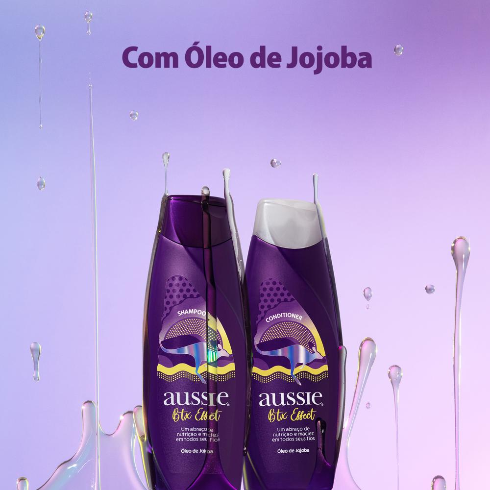 O Condicionador Aussie Botox Effect 360ml nutre e fortalece os fios, mantendo-os alinhados e disciplinados. Dá brilho, protege as pontas duplas e controla a umidade, para um efeito botox capilar. Ele ainda deixa o cabelo com aquele cheirinho de Aussie que todo mundo ama. - Um abraço de nutrição e alinhamento nos seus fios. - Efeito progressiva caseira, sem alisamento químico. - Aussie hidrata mais do que uma marca líder em perfumaria*. - Fórmula dos Estados Unidos e inspirada na Austrália. - Com Óleo de Jojoba. - 100% livre de amônia, sulfato, parabenos, petrolatos e corantes. - Vegano e Cruelty Free. Dicas para um efeito maravilhAussie: 1. Lave bem o seu cabelo com o Shampoo Aussie Botox Effect. Repita até que sinta seu cabelo totalmente limpo. 2. Tire o excesso de água do cabelo. Se precisar, use uma toalha macia e seca. 3. Aplique o 3 Minutos Milagrosos Aussie Botox Effect, deixe agir por 3 minutos e enxágue. 4. Aplique o Condicionador Aussie Botox Effect para selar as cutículas e enxágue. 5. Seque bem o cabelo com secador para obter um efeito ainda mais alinhado dos fios. Finalize com uso da prancha, se desejar. Óleo de Jojoba. Botox Capilar e alinhamento do fio. 100% livre de amônia, sulfato, parabenos, petrolatos e corantes. Tipo progressiva caseira. Condicionador vegano. *Marca entre as 3 mais vendidas em perfumarias identificada de acordo com Euromonitor International Limited; Cuidados para o Cabelos é a agregação de shampoos, condicionadores, agentes de modelagem, tratamentos contra a queda de cabelo, produtos 2 em 1, permanentes e relaxantes, colorantes e cuidados profissionais do tipo salão de beleza. Perfumarias inclui lojas cuja atividade principal seja a venda de produtos cosméticos, de toalete ou de higiene pessoal. Vendas no ano de 2020 em volume (unidades vendidas).