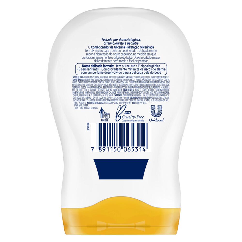 Condicionador Baby Dove Hidratação Glicerinada 200ml • Hipoalergênico. • pH neutro para o cabelo recém-nascido. • Sem lágrimas, corantes, parabenos, ftalatos, sulfatos. • Suave até para recém-nascidos. • Ajuda a repor a hidratação essencial aos cabelos. • Testado por dermatologista, oftalmologista e pediatra. Nosso Condicionador de Glicerina Baby Dove é hipoalergênico e vai além da suavidade ao ajudar a repor hidratação essencial aos cabelos desde o primeiro banho. Ele condiciona delicadamente os cabelos do bebê, mantendo-os macios e fáceis de pentear. Comprovadamente minimiza os riscos de alergia com um perfume desenvolvido para a delicada pele do bebê. Esse condicionador ajuda a repor a hidratação e deixa os cabelos macios e delicadamente perfumados. Sem lágrimas, com fórmula hipoalergênica e com um perfume desenvolvido especialmente para bebês, lavar os cabelos do seu pequeno se torna tão agradável para eles quanto é para você. Esse condicionador também pode ser usado em todos os tipos de cabelos, deixando-os fáceis de pentear e ajudando a se livrar dos nós após o banho. Aproveite toda hora do banho com essa atençãoa fórmula hipoalergênica, sem lágrimas. Com um perfume delicado, esse condicionador para bebês deixados nos cabelos do seu pequeno saudável. Experimente o Shampoo de Glicerina Baby Dove que é hipoalergênico e vai além da suavidade ao ajudar a manter a hidratação e os nutrientes essenciais ao couro cabeludo desde o primeiro banho, mantendo os cabelos do bebê macios e visivelmente saudáveis. - Compre Produtos Dove.