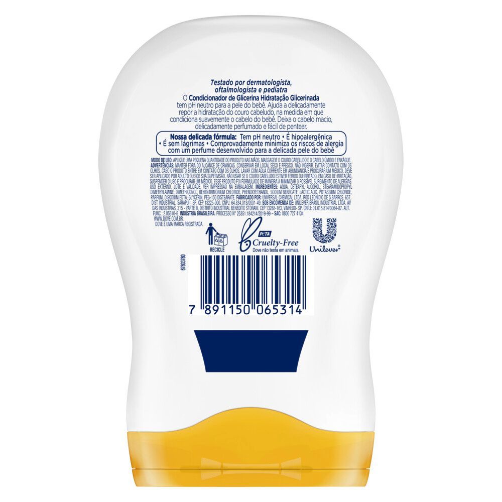 Condicionador de Glicerina Baby Dove Hidratação Glicerinada • Hipoalergênico • pH neutro para o cabelo do recém-nascido • Sem lágrimas, corantes, parabenos, ftalatos, sulfatos • Suave até para recém-n