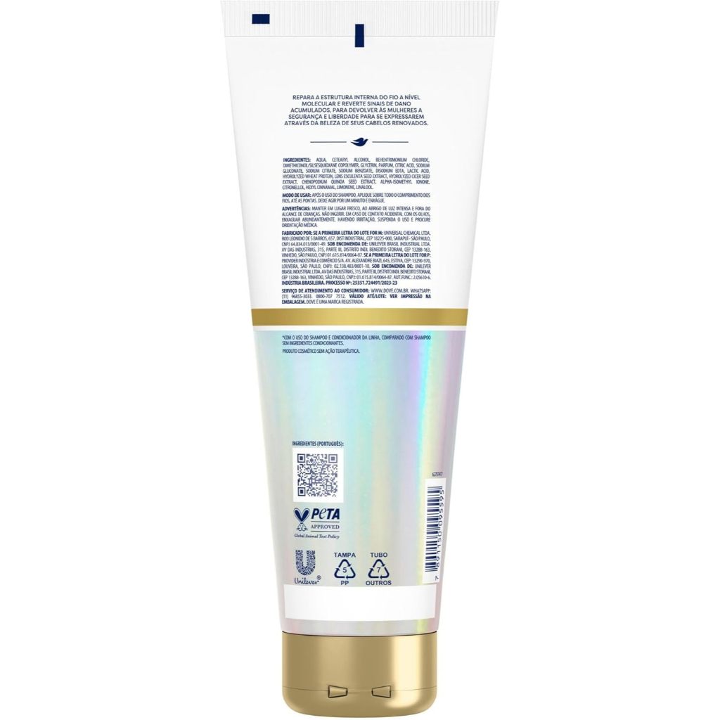 Condicionador Dove Bond Intense Repair Reparação Intensa com 250ml O Condicionador Dove Bond Intense Repair Reparação Intensa é a escolha ideal para quem busca recuperação profunda dos cabelos danificados. Com tecnologia inovadora que repara a estrutura interna dos fios, este condicionador fortalece, hidrata e devolve a vitalidade dos cabelos expostos a processos químicos, térmicos ou agressões externas. Principais Características: ✔ Tecnologia de Reconstrução Molecular: Repara as ligações capilares quebradas, restaurando a força interna da fibra capilar. ✔ Ação hidratante e desembaraçante: Facilita o penteado, reduz a quebra e deixa os fios mais suaves ao toque. ✔ Resultado visível desde o primeiro uso: Cabelos mais resistentes, brilhantes e com aparência saudável já nas primeiras aplicações. Benefícios: - Reconstrução intensa de danos causados por química e calor. - Fortalecimento capilar e redução da quebra. - Fios mais hidratados, maleáveis e com brilho. - Sensação de cabelo saudável e macio diariamente. Diferenciais do Produto: - Fórmula de alto desempenho com Tecnologia Bond Repair, inspirada nos tratamentos de salão. - Produto testado dermatologicamente e indicado para todos os tipos de cabelo danificados. - Desenvolvido pela Dove, marca referência em cuidado capilar. - Textura cremosa que promove hidratação profunda sem pesar. Especificações Técnicas: - Peso: 250ml Instruções de Uso: - Após lavar os cabelos com shampoo, aplique o condicionador nos fios ainda úmidos, do comprimento até as pontas. - Massageie suavemente, deixe agir por 1 a 3 minutos e enxágue bem. Avisos e Precauções: - Uso externo. - Evite contato com os olhos. - Em caso de contato, enxágue abundantemente com água. - Manter fora do alcance de crianças. - Armazenar em local seco, fresco e longe da luz direta. O que está incluso? - 1 unidade do Condicionador Dove Bond Intense Repair Reparação Intensa – 250ml ---- DÚVIDAS FREQUENTES ---- Os produtos são originais? Sim. Todos os nossos produtos são originais. Emitem nota fiscal? Sim. Emitimos nota fiscal para todos os pedidos.