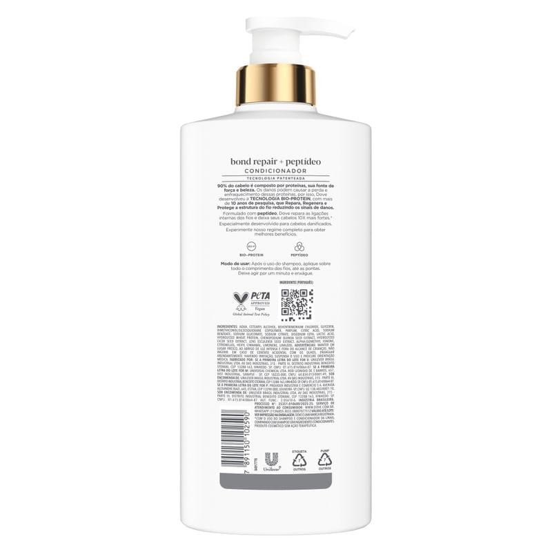 Condicionador Dove Reconstrução+ Peptídeo - Expert em Danos Dove Condicionador Intense Bond Repair + Peptídeo é um condicionador para cabelos danificados, ideal para quem busca reparação profunda e cabelos mais fortes. Sua fórmula avançada reconstrói as ligações internas dos fios, proporcionando 10X mais força e reduzindo visivelmente os sinais de danos desde a primeira aplicação. Com a exclusiva Tecnologia Bio-Protein, resultado de mais de 10 anos de pesquisa, Dove entrega um cuidado completo que repara, regenera e protege a estrutura capilar. Essa tecnologia patenteada atua diretamente nas proteínas do fio, que representam 90% da sua composição natural, restaurando a força e a beleza dos cabelos. Benefícios: - Dove Condicionador Bond Intense Repair + Peptídeo repara profundamente os fios danificados e fortalece o cabelo com sua tecnologia exclusiva Bio-Protein. - O condicionador para cabelos danificados, restaura as ligações internas do fio e proporciona 10X mais força com o uso da linha completa. - Desenvolvido com peptídeo, ingrediente poderoso que atua na reconstrução e na regeneração da estrutura capilar fragilizada. - Resultado de mais de 10 anos de pesquisa, a fórmula oferece um tratamento completo que repara, regenera e protege os cabelos danificados. - Sua textura cremosa proporciona hidratação profunda, desembaraço fácil e brilho imediato, para cabelos visivelmente mais saudáveis. Como funciona o Condicionador Dove Reconstrução+ Peptídeo? - Tecnologia Bio-Protein: Age dentro da fibra capilar, reparando as ligações internas rompidas por danos químicos e mecânicos. - Peptídeos: Atuam como blocos de construção da proteína capilar, reforçando a estrutura e prevenindo novas quebras. - Ação imediata: Cabelos mais fortes, macios e alinhados já no primeiro uso. - Ação contínua: Com o uso diário, os fios ficam progressivamente mais resistentes e menos suscetíveis a danos futuros. Como Usar? Lave os cabelos com o Shampoo Dove Bond Repair + Peptídeo, aplique o condicionador no comprimento e pontas, evitando a raiz. Enriquecido com peptídeo, o Dove Condicionador Bond Repair é ideal para cabelos danificados por processos químicos, exposição ao calor ou agressões externas. Sua ação regeneradora deixa os fios mais resistentes, macios e saudáveis com o uso contínuo. Pode ser usado diariamente ou conforme a necessidade de tratamento intensivo. Dica:Se seus cabelos estão extremamente danificados, utilize o condicionador em conjunto com uma máscara de tratamento da linha pelo menos 2 vezes na semana. Sobre Dove A Dove é uma das marcas mais reconhecidas e confiáveis do mundo quando o assunto é cuidado pessoal. Presente em mais de 80 países, Dove faz parte do grupo Unilever e é conhecida por oferecer produtos que combinam ciência avançada e cuidado delicado com a pele e os cabelos. Com foco em promover a autenticidade e autoestima real, Dove acredita que a beleza deve ser uma fonte de confiança, não de insegurança. Seus produtos são formulados para oferecer eficácia comprovada sem abrir mão da suavidade e da qualidade.
