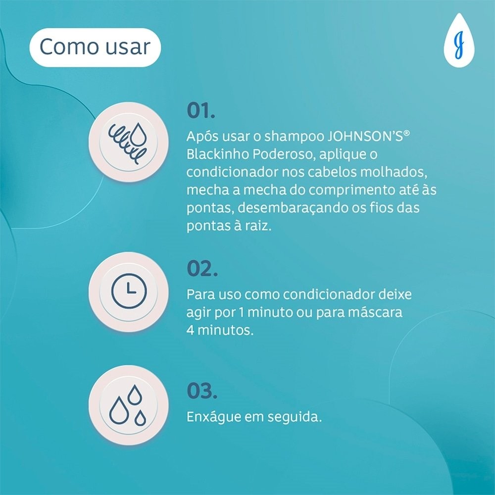 Características Principais do Produto: Marca: Johnson's Baby Linha do Produto: Kids Blackinho Poderoso EAN: 7891010255022 Características Adicionais: Possuí óleo de coco em sua fórmula. Para cabelos com cachos 3B a 4C. Livre de parabenos, sulfatos, corantes, silicones e petrolatos. Possui dupla ação. Hipoalergênico. Dermatologicamente Testado. Classificação indicativa para a partir de 3 Anos. Destinado público infantil. Modo de Uso: Após usar o shampoo Johnson's Blackinho Poderoso, aplique o condicionador nos cabelos molhados, mecha a mecha do comprimento até às pontas, desembaraçando os fios das pontas à raiz. Para uso como condicionador deixe agir por 1 minuto ou para máscara 4 minutos. Em seguida, enxágue bem. Fornecedor: Kenvue