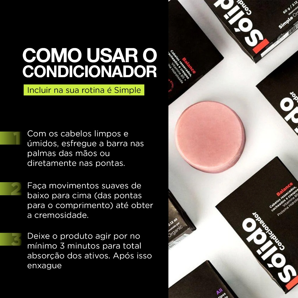 Complemento perfeito para o Shampoo Sólido Balance, nosso condicionador chegou para cuidar dos cabelos cacheados e ressecados. Hidrata profundamente, promove brilho, reduz o frizz e auxilia na reconstrução dos fios danificados. Um pouquinho mais sobre os ativos do condicionador sólido Balance: Vitamina B5 (Pantenol): Responsável pelo bom desempenho das enzimas e essencial para o equilíbrio de nutrientes no couro cabeludo. Ela penetra a haste capilar, toma conta dos fios e vai até a raiz dos cabelos, proporcionando imediatamente um visual mais hidratado, sedoso e saudável. Proteína Hidrolisada de Ervilha: Penetra com maior facilidade na superfície dos fios, é um reconstrutor perfeito, delicado e biodegradável. Os aminoácidos constituintes dessa proteína se assemelham aos que formam a queratina, garantindo uma alta atividade reconstrutora, que aumenta a resistência e vitalidade dos fios de cabelo. A Proteína hidrolisada vem formulada juntamente com extrato de confrei, extrato de cebola e ácido hialurônico. Esses ingredientes atuam sinergicamente aumentando o diâmetro e a resistência dos fios, os deixando mais encorpados, cheios de volume, brilhantes e sem frizz. Ácido hialurônico: Atua diretamente nos danos causados pelo ressecamento, o que reduz o frizz capilar e hidrata profundamente os fios. Essa hidratação protege os fios, evitando a abertura da cutícula e estimula a regeneração dos fios, aumenta o brilho das mechas e a vitalidade do cabelo. Ativos Secundários: Manteiga de Karité: emoliente super eficaz que possui ação protetora sobre a pele e os cabelos, promovendo uma hidratação intensa e profunda através da retenção de umidade. Proporciona brilho, maciez e flexibilidade. Extrato de confrei: Rico em alantoína, que promove atividade emoliente. Promove a hidratação e previne o ressecamento. Extrato de cebola: rico em antioxidantes, promove a proteção e manutenção dos fios de cabelo. Aroma: Baunilha Moda de Usar: Aplicar o condicionador na ponta dos cabelos úmidos e, com o auxílio das mãos, fazer movimentos de baixo para cima até obter a cremosidade desejada. Deixe agir por pelo menos 3 minutos. Enxaguar em seguida. Precauções: Uso externo. Manter longe do alcance de crianças. Evitar contato com os olhos. Armazenar em local seco, arejado, ao abrigo da luz e outras fontes de calor. Em caso de irritação, suspenda o uso e, caso os sinais persistam, procure um médico. Composição: Cetyl Alcohol, Brassicamidopropyl Dimethylamine, Lactic Acid, Butyrospermum parkii Butter, Elaeis guineensis Kernel Oil, Persea gratissima Oil, Glycerin, Caprylic/Capric, Triglyceride, Sodium Stearoy,l Glutamate, Aqua, Pantheno,l Sorbitan Caprylate, Rosmarinus officinalis Leaf Extract, Propanediol, Benzoic Acid, Tocopherol, Vanilla planifolia Fruit Extract, Helianthus annuus Seed Oil, CI 75120, Hydrolyzed Pea Protein, Sodium Benzoate, Potassium Sorbate, Symphytum Officinale Leaf Extract, Allium Cepa Bulb Extract, Sodium Hyaluronate. Composição (português): Álcool Cetílico, Brassica-amidopropil Dimetilamina, Ácido Láctico, Manteiga de Butyrospermum parkii, Óleo da Semente de Elaeis guineensis, Óleo de Persea gratissima, Glicerol, Triglicerídeo Caprílico/Cáprico, Estearoil Glutamato de Sódio, Água, Pantenol, Caprilato de Sorbitana, Extrato da Folha de Rosmarinus officinalis, Propanodiol, Ácido Benzoico, Tocoferol, Extrato do Fruto de Vanilla planifolia, Óleo de Girassol, Laranja Urucum 160b, Proteína da Ervilha Hidrolisada, Benzoato de Sódio, Sorbato de Potássio, Extrato da Folha de Symphytum officinale, Extrato do Bulbo de Allium cepa, Hialuronato de Sódio. Conteúdo: 60 g Venc: 06/2024