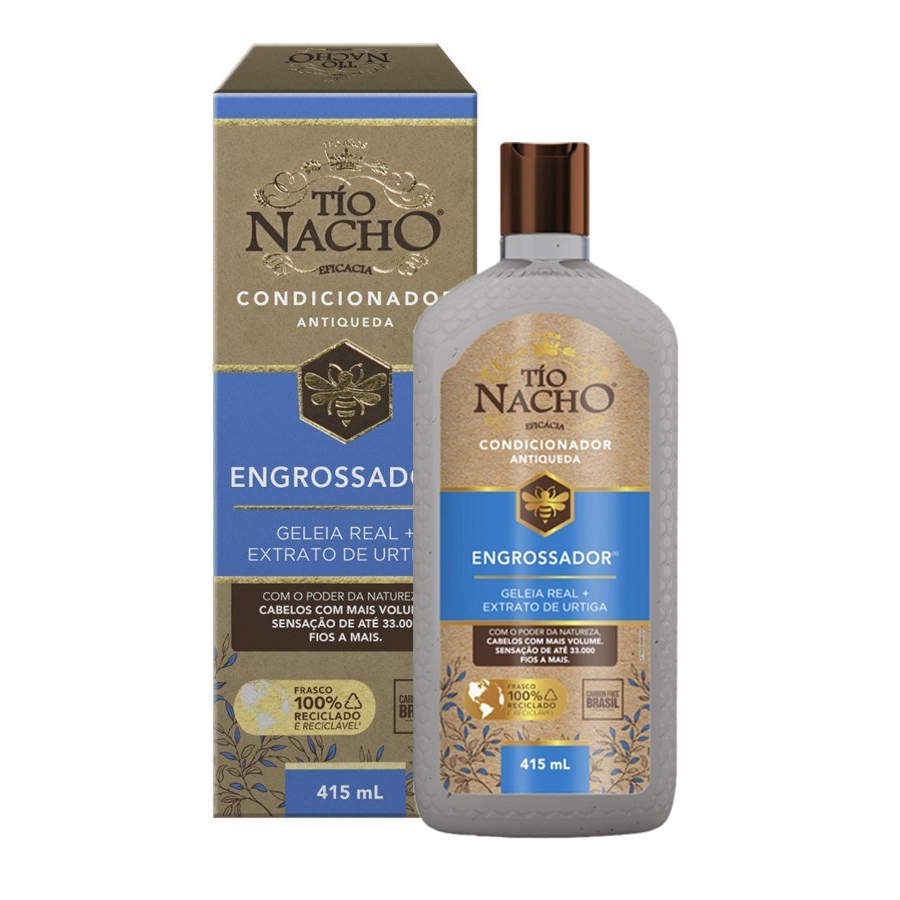 O Condicionador Tio Nacho Engrossador contém exclusiva combinação de geléia real com Capilgross e extratos de origem natural, que aumentam a espessura do fio e evitam a queda, proporcionando cabelo mais forte, volumoso e saudável. Indicado para cabelos com pouco volume. Benefícios: - Proporciona um aumento na espessura dos fios, fortalece e revitaliza o couro cabeludo; - Além disso, devolve o brilho e a força dos cabelos opacos e quebradiços. Modo de usar: Após o uso do shampoo, aplique sobre todo o comprimento dos fios, até as pontas. Deixe agir por um minuto e enxágue. Precauções: Produto de uso cosmético. Mantenha fora do alcance de crianças. Evite o contato com os olhos. Em caso de contato acidental, enxágue a região abundantemente.