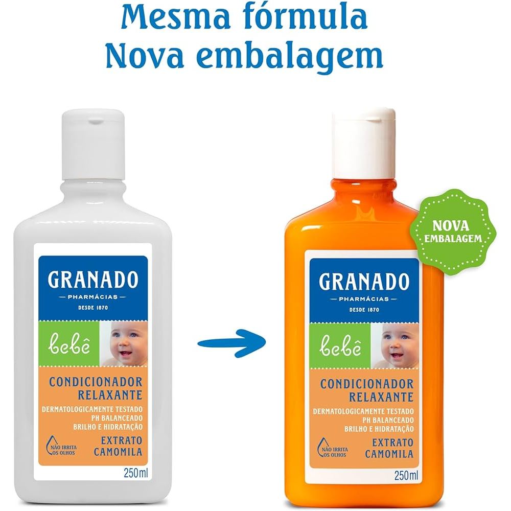 O Condicionador Granado Bebê Extrato Camomila foi especialmente desenvolvido para proteger e hidratar os cabelos delicados do bebê é enriquecido com óleo de amêndoas e PCA-NA, que proporcionam hidratação e maciez, facilitando o pentear e desembaraçando os fios com mais agilidade. O produto é vegano, livre de parabenos, silicones e corantes. Nenhum produto Granado é testado em animais.