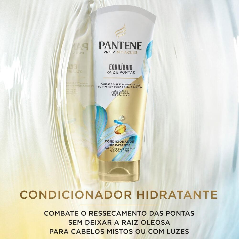 Você sente que tem dois cabelos em um? Já tentou de tudo para deixar as pontas dos cabelos com a mesma hidratação da raiz sem deixá-la pesada e oleosa? Então o Condicionador Hidratante Pantene da coleção Equilibrio Raiz e Pontas com óleo de baobá e algas marinhas é ideal para você. Seu complexo Pro-V Miracle penetra profundamente nos fios equilibrando os cabelos mistos, hidratando profundamente as pontas ressecadas ou espigadas e proporcionando o aspecto saudável que você tanto merece. Além disso, sua fórmula com ingredientes hidratantes e purificantes é segura para cabelos com luzes, deixando-os mais soltinhos, frescos e brilhosos. Mergulhe nas sensações de exuberância, pureza e leveza de coração com a fragrância repleta de notas alegres de laranja, toranja, groselha e notas florais com uma pitada de água de coco que vão transportar você para uma experiencia inesquecível. A coleção Pantene Equilíbrio Raiz e Pontas elimina a oleosidade da raiz e hidrata as pontas.