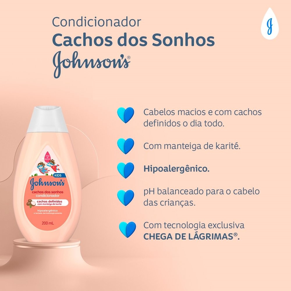O que é e para que serve? O cabelo das crianças é mais fino e delicado que o cabelo dos adultos. Por isso, criamos a linha JOHNSONS BABY desenvolvida para crianças, formulada com ingredientes de origem natural específicos para os pequenos: Cabelos macios, brilhantes e saudáveis. O Condicionador Infantil Para Cabelos Cacheados JOHNSON Cachos dos Sonhos, 200mL com manteiga de karité ajuda a controlar o volume do cabelo, deixando-o com cachos definidos, naturais e macios o dia todo. Toda a linha é hipoalergênica, formulada para ser suave, livre de corantes, parabenos, sulfatos e ftalatos. Com pH fisiológico e dermatologicamente testado. Benefícios e diferenciais: Cachos definidos e naturais com manteiga de karité Ajuda a controlar o volume do cabelo Cabelos macios e com cachos definidos o dia todo. Hipoalergênico, formulado para ser suave. PH ideal para a delicada pele da criança Dermatologicamente testado. A fórmula CHEGA DE LÁGRIMAS® permite uma experiência sem choro, por ser suave aos olhos. Livre de ingredientes que são agressivos à pele da criança (corantes, parabenos, ftalatos e sulfato). Como usar: Depois de usar o baby shampoo JOHNSON Cachos dos Sonhos, aplique o condicionador nos cabelos molhados, massageando-os suavemente. Deixe agir por alguns instantes e, em seguida, enxágue bem. Adequado para o uso diário. Indicações de uso: Para crianças de todas as idades Precauções: Mantenha fora do alcance de crianças. Deve ser aplicado por adultos ou sob sua supervisão. Evitar contato com os olhos. Caso o produto entre em contato com os olhos, lavar com água corrente em abundância e procurar um médico. Não usar se o couro cabeludo estiver ferido ou irritado. Em caso de irritação, suspender o uso e procurar um médico. Conservar em local fresco e ao abrigo da luz solar direta. Este produto foi formulado de maneira a minimizar possível surgimento de alergia. *Do ressecamento. Fornecedor: Kenvue