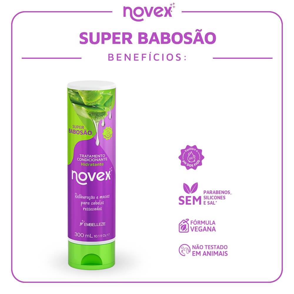 Detalhes: Sua dose extra de poder Novex resolveu trazer para você e seus cabelos o tratamento condicionante SuperBabosão. SuperUmectação, Hiper-Restauração e uma Mega-Hidratação esses são os principais benefícios da babosa, esse superativo que vai definitivamente trazer uma dose extra de poder para você. E tem mais! A Babosa também reduz a queda, recupera os cabelos quebradiços, nutre profundamente os fios e deixa as madeixas incrivelmente lindas e tratadas. Características: INDICAÇÃO Indicado para todos os tipos de cabelos. AÇÃO Super-Reparação. HiperUmectação. MegaHidratação. ATIVOS Babosa e Hidrovance. BENEFÍCIOS A Babosa é um ativo de ação hidratante que proporciona brilho e maciez aos cabelos. Hydrovance é um ativo que age na fibra capilar desde a cutícula até a medula, proporcionando hidratação, reparo, fortalecimento, melhoria no sensorial, controle de frizz & volume, aspecto natural e maciez. RESULTADO Você com uma dose extra de poder! MODO DE USO 1 - Lave o cabelo com o shampoo Vitay de sua preferência e deixe a água fluir sobre os fios. 2 - Aplique Novex SuperBabosão em toda a extensão dos fios. Para potencializar o tratamento utilize touca plástica. 3 - Deixe agir por 10 minutos. Enxágue. Finalize como de costume dando seu toque pessoal. COMPOSIÇÃO: AQUA, CETEARYL ALCOHOL, ZEA MAYS STARCH, BUTYROSPERMUM PARKII BUTTER, GLYCINE SOJA OIL, CETRIMONIUM CHLORIDE, BENZYL ALCOHOL, PARFUM, ALCOHOL, HYDROXYETHYL UREA, BENZOIC ACID, BHT, CETEARETH-60 MYRISTYL GLYCOL, ALOE BARBADENSIS LEAF EXTRACT, HEXYL CINNAMAL, SORBIC ACID, LINALOOL, BUTYLPHENYL METHYLPROPIONAL, SORBITOL, D-LIMONENE, TOCOPHERYL ACETATE, LACTIC ACID, POTASSIUM SORBATE, SODIUM BENZOATE.