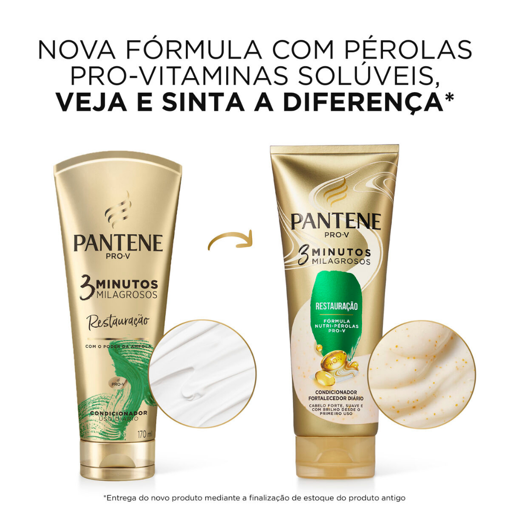 Se você sente que os condicionadores comuns não são suficientes para cuidar de seus cabelos, este condicionador Pantene é ideal para o seu cronograma capilar. O condicionador de uso diário Pantene 3 Minutos Milagrosos Restauração sem sal* com Pérolas Pro-Vitaminas solúveis e aminoácidos ajuda a reduzir a perda de proteínas e reparar as cutículas para prevenir as pontas duplas. Deixa o cabelo forte, suave e com brilho desde o primeiro uso. Condicionador de reconstrução capilar para cabelos danificados. Repara 100% do dano em 3 minutos**.As Pérolas Pro-V são partículas que liberam milhões de lípidos que se dissolvem no creme, uma tecnologia patenteada. A fórmula Nutri-Pérolas Pro-V é uma infusão reparadora contra o dano***, além de proporcionar uma experiência única no banho. Sinta a diferença e experimente uma transformação nunca antes vista. *Sem adição de NaCl. **Dano à suavidade medido em cabelo com dano químico, térmico e mecânico. ****Dano ao brilho e a suavidade.SHORT DESCRIPTION:O condicionador de uso diário Pantene 3 Minutos Milagrosos Restauração sem sal** com Pérolas Pro-Vitaminas solúveis e aminoácidos repara 100% do dano em 3 minutos*. A fórmula com Pérolas Pro-V deixa seu cabelo forte, suave e com brilho desde o primeiro uso. Reconstrução capilar para cabelos danificados, ideal para o seu cronograma capilar.*Dano à suavidade medido em cabelo com dano químico, térmico e mecânico. **Sem adição de NaCl. • O Condicionador Pantene 3 Minutos Milagrosos Restauração contém Pérolas Pro-V solúveis e aminoácido • Deixa seu cabelo forte, suave e com brilho desde o primeiro uso • Este condicionador de uso diário é ideal para cabelos danificados • Repara 100% do dano em 3 minutos* • Ideal para o seu cronograma capilar • Condicionador sem sal** • *Dano à suavidade medido em cabelo com dano químico, térmico e mecânico • **Sem adição de NaCl