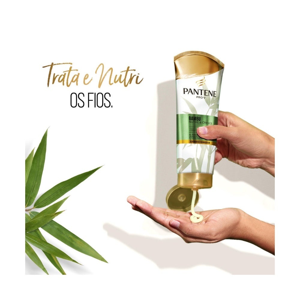 A coleção Pantene Bambu Nutre e Cresce foi criada para ajudar no ciclo da quebra de cabelo, nutrindo desde as raízes, para o cabelo crescer mais forte. O Condicionador trata o cabelo e as cutículas, deixando-o mais forte e sedoso, com uma poderosa hidratação. Com extrato de bambu, óleo de rícino e cafeína. Contém 0% de sulfatos, parabenos e óleos minerais. O poder de combate à quebra de Pantene Bambu está disponível em produtos de toda a linha, shampoo, condicionador, creme para pentear, máscara nutritiva. Agora, você pode combater a quebra porque um Cabelo Pantene diz meu crescimento não tem limites! · Cabelo mais forte e sedoso com uma poderosa hidratação · Para um cabelo mais resistente · O bambu é mais forte que madeira, concreto e aço e pode ser flexível com o vento, sem quebrar · O óleo de rícino, que é rico em ômega 9, tem poder hidratante e pH balanceado · A cafeína, conhecida por promover regeneração celular, também melhora a circulação sanguínea · Uma nova fragrância que transmitirá uma sensação de natureza, com um aroma inspirado nas florestas de bambu Modo de uso: Aplique o shampoo nos cabelos úmidos, distribua o condicionador pelo comprimento e ponta dos fios de cabelo e massageie suavemente. Deixe agir por dois minutos e enxague bem em seguida.