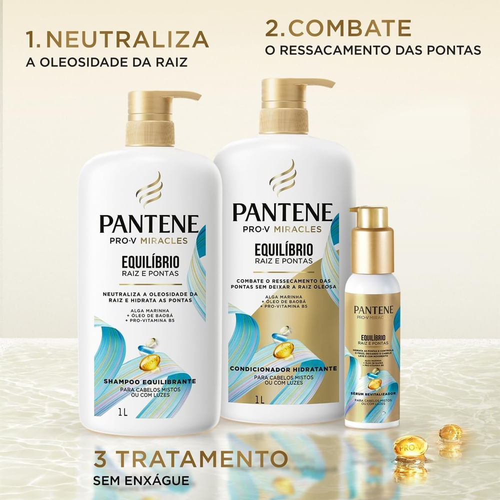 O Condicionador Pantene Equilíbrio 1 Litro foi desenvolvido especialmente para cabelos mistos e oleosos, que exigem um cuidado mais equilibrado, oferecendo a hidratação necessária sem pesar nos fios ou deixar a raiz oleosa. Com a exclusiva tecnologia Pro-V, esse condicionador proporciona uma fórmula leve e eficaz, ideal para quem busca controlar a oleosidade da raiz enquanto mantém a hidratação nas pontas, resultando em cabelos saudáveis e com movimento natural. Muitas pessoas que possuem cabelo oleoso enfrentam o desafio de manter a raiz controlada sem que o comprimento e as pontas fiquem ressecados. Esse condicionador ajuda a regular a produção de oleosidade, proporcionando um cabelo mais limpo e leve, com maior tempo entre as lavagens, sem danificar as pontas.Benefícios:- Equilíbrio perfeito para cabelos mistos e oleosos;- Controle de oleosidade na raiz;- Hidratação profunda e suavidade;- Exclusiva fórmula Pro-V;- Brilho natural e maciez.Modo de usar: Aplique o condicionador sobre os cabelos úmidos, começando pelas pontas, massageando suavemente os cabelos, deslizando os fios entre os dedos até que estejam perfeitamente desembaraçados. Deixe agir por 1 minuto e enxágue.Sobre a marca: Pantene foi lançada na Europa em 1947, o nome se refere a origem do produto o Panthenol que é o nome cientifico da vitamina B5. A marca possui produtos com características nunca vistas no mercado, pois são fabricados com uma fórmula 7 vezes mais efetiva. Seus produtos possuem tecnologia Pro-V que fortalece e repara o fio evitando a quebra e reduzindo em até 98% a queda, isso em apenas uma semana.