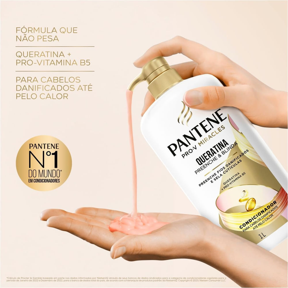 O Condicionador Pantene Pro-V Miracles Queratina 1 Litro foi desenvolvido para proporcionar um cuidado intensivo e restaurador aos seus cabelos. Enriquecido com queratina e pro-vitamina B5, penetra profundamente nos fios, fortalecendo e revitalizando desde o interior. Sua fórmula nutre intensamente, proporcionando hidratação profunda e combatendo o ressecamento. Ajuda a restaurar a elasticidade dos cabelos, deixando-os mais macios e com aspecto saudável. Ideal para cabelos danificados e com necessidade de reparação, proporciona resultados visíveis desde a primeira aplicação. Desfrute de cabelos revitalizados, brilhantes e cheios de vida Benefícios:- Fortalece e revitaliza os fios;- Hidratação profunda e nutrição intensa;- Restaura a elasticidade e previne o ressecamento;- Deixa os cabelos macios e saudáveis. Modo de usar: Aplique o condicionador sobre os cabelos úmidos, começando pelas pontas, massageando suavemente os cabelos, deslizando os fios entre os dedos até que estejam perfeitamente desembaraçados. Deixe agir por 1 minuto e enxágue. Sobre a marca: Pantene foi lançada na Europa em 1947, o nome se refere a origem do produto o Panthenol que é o nome cientifico da vitamina B5. A marca possui produtos com características nunca vistas no mercado, pois são fabricados com uma fórmula 7 vezes mais efetiva. Seus produtos possuem tecnologia Pro-V que fortalece e repara o fio evitando a quebra e reduzindo em até 98% a queda, isso em apenas uma semana.