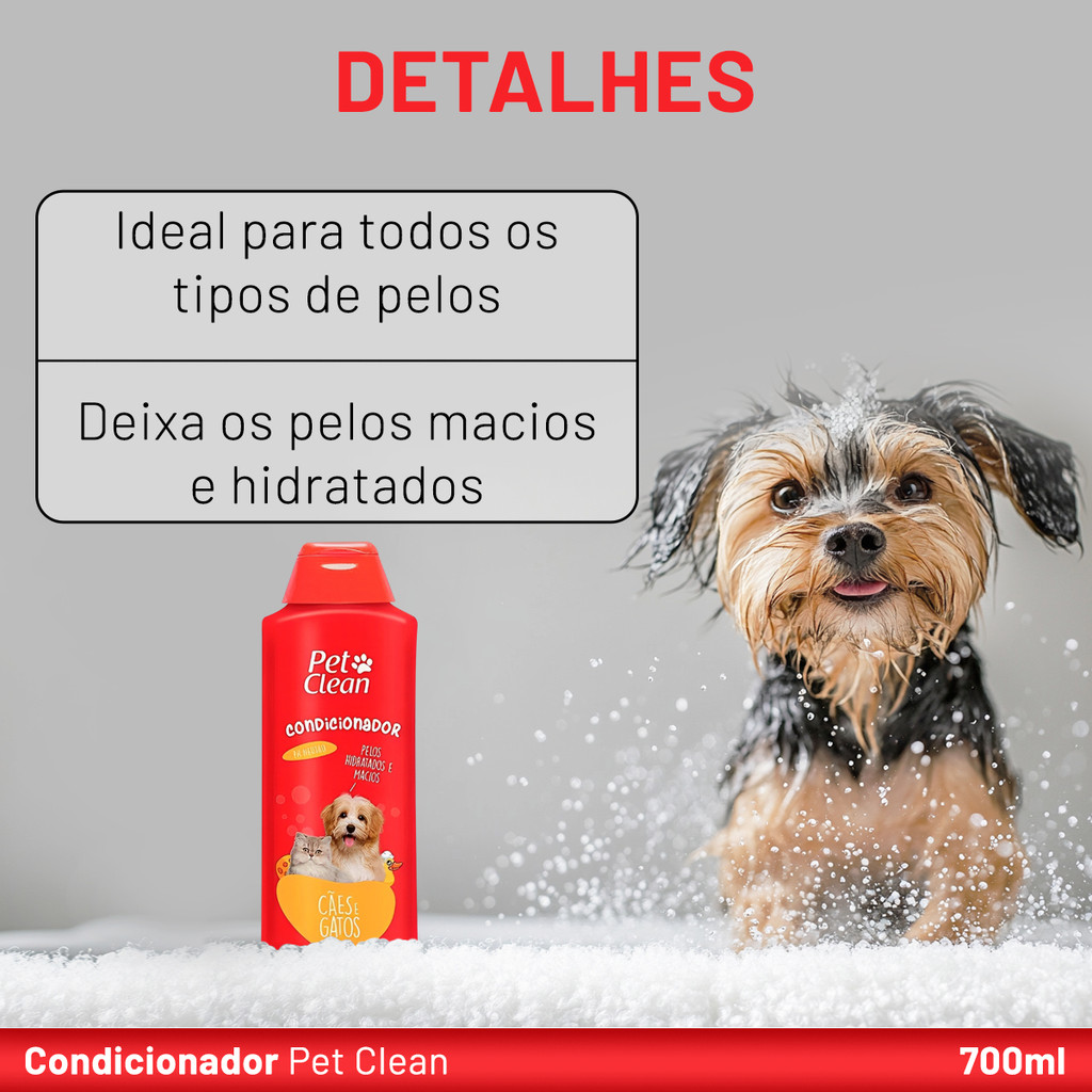 O Condicionador Pet Clean Petlook foi desenvolvido especialmente para cães e gatos, proporcionando hidratação intensa, brilho e maciez aos pelos. Com fórmula de alta qualidade, facilita o desembaraço, reduz o frizz e deixa a pelagem suave ao toque, valorizando a estética do animal após o banho. Indicado tanto para uso profissional quanto doméstico, o Condicionador Petlook garante resultado superior, promovendo bem-estar e cuidado seguro para o seu pet. FICHA TÉCNICA Marca: Pet Clean Linha: Petlook Indicação: Cães e gatos Volume: 700 ml Ação: Hidrata, desembaraça e proporciona brilho Tipo de uso: Profissional e doméstico Apresentação: Frasco de 700 ml com tampa prática CUIDADOS COM O PRODUTO Evite contato direto com os olhos e mucosas do animal Uso exclusivo externo em animais Mantenha fora do alcance de crianças Armazene em local fresco, seco e ao abrigo da luz solar Leia e siga corretamente as instruções do rótulo