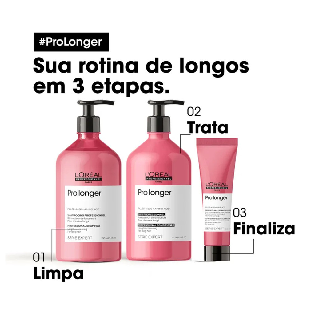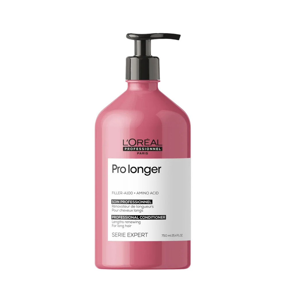 L'Oréal Professionnel Serie Expert Pro Longer 750ml- L'oréal Sobre o Produto: Auxiliando na renovação da aparência da fibra capilar, deixando o cabelo sedoso, hidratado e com mabealidade, o condicionador Pro Longer foi desenvolvido para cobelos longos e pontas afinadas ou danificados e proporciona uma redução de 34% das pontas duplas. Sua fórmula devolve a densidade á pontas dos fios, reduzindo drasticamente a quebra do cabelo e as pontas duplas.A tecnologia Filler-A100 faz com que o produto penetre no núcleo da fibra capilar para preencher e densificar a estrutura do cabelo por dentro enquanto os aminoácidos trabalham para fortalecer o cabelo pelo lado de fora. Filler-A100: Molécula patenteada e exclusiva de L'oréal Professionnel. Composta pela combinação de dois ativos:Filloxane+Polyquartenium PQ6.Os dois ativos penetram no núcleo da fibra densificando e preenchendo as extremidades. Aminoácidos: Permite renovar comprimentos, trazendo força para a fibra. O resultado é um cabelo protegido e prevenido de novas quebras. Como usar: Com os cabelos lavados e úmidos, aplique o condicionador Pro Longer no comprimento e nas pontas e massageie bem as mechas para distribuir o produto uniformemente. Deixe agir por 2 a 3 minutos, emulsione e enxágue bem. Não recomendado o uso na raiz dos cabelos. Dica Poderosa: o condicionador pode ser usado após a máscara de tratamento para selar as cutículas do cabelo.
