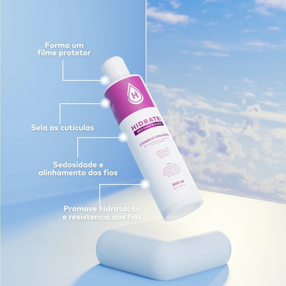 O Condicionador Reconstrutor Hidratei é a solução definitiva para cabelos danificados e quebradiços. Formulado com ingredientes de alta performance, este condicionador não só repara profundamente os fios, mas também os fortalece, devolvendo sua vitalidade e brilho natural. Ingredientes Ativos: - VITALISTIC MX: Matriz 3D de liberação prolongada de Biotina, D-Pantenol e Aminoácidos. - HYDROXYSHIELD POLYMER: Forma um filme de proteção suavizando a porosidade do cabelo e aumentando a hidratação. - ÓLEO DE ABACATE: Confere uma reposição lipídica e de vitaminas nos fios. Modo de Uso: Com o cabelo limpo e úmido, aplique o condicionador nas mãos e espalhe no comprimento dos fios. Massageie por alguns minutos e enxágue. Para um tratamento completo, use todos os produtos da Linha Reconstrução Hidratei. Indicamos o uso do Condicionador Reconstrutor Hidratei pelo menos uma vez por semana até a recuperação completa do cabelo. A periodicidade pode ser ajustada conforme a necessidade dos fios. Benefícios: - Reconstrução Intensa - Hidratação Profunda - Proteção e Resistência - Menos Quebra - Crescimento Saudável - Brilho e Maciez - Alinhamento e Redução de Frizz - Fórmula Vegana e Livre de Crueldade