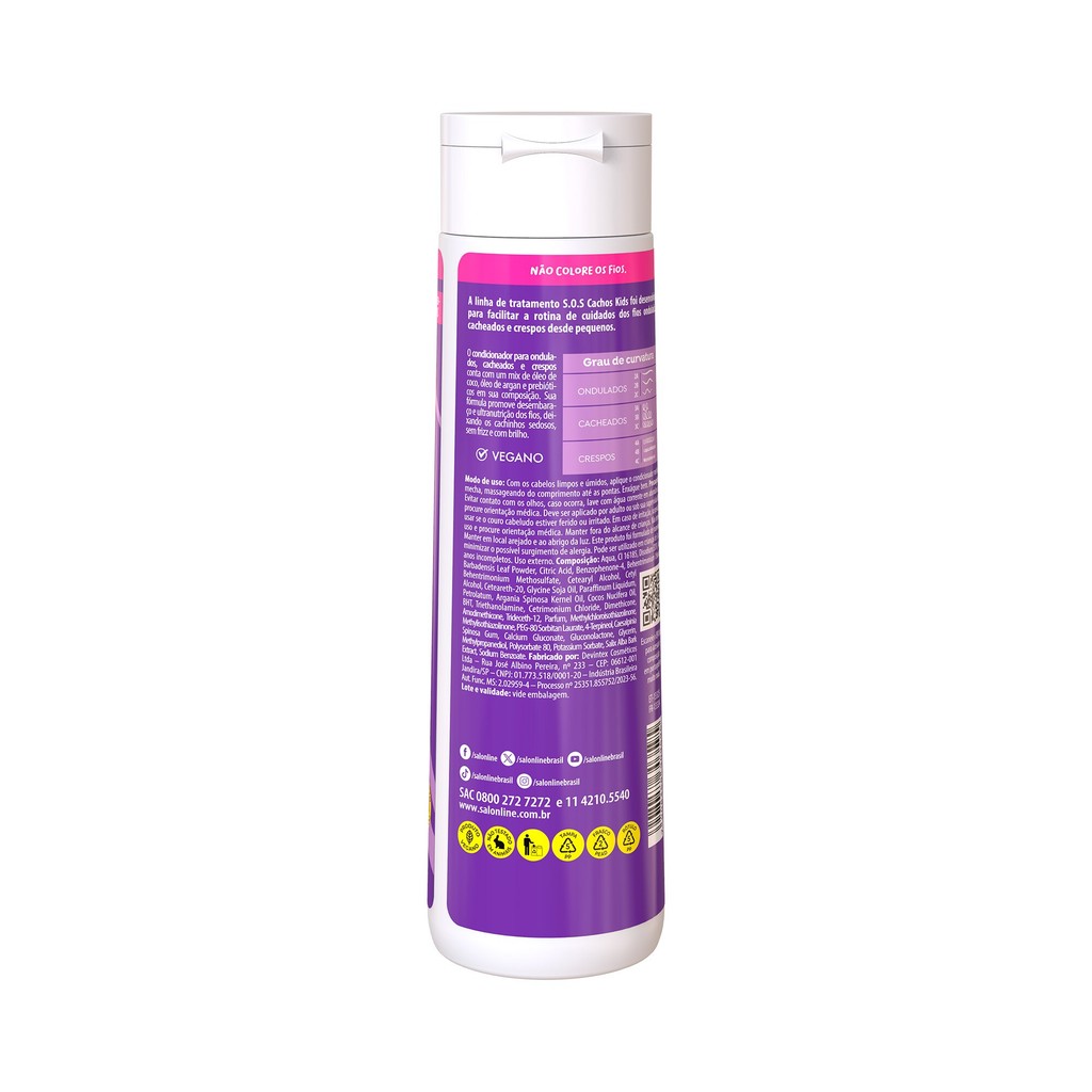 O Condicionador Infantil S.O.S Cachos Kids Definição foi feito para facilitar a rotina dos pais no cuidado dos cabelos das crianças. Ele traz fios comportados que, além de deixar os cabelos mais sedosos e desembaraçados, controla o frizz e deixa os cachos definidos e com brilho intenso. INDICAÇÕES Para quais tipos de cabelo? Cabelos ondulados, cabelos cacheados, cabelos crespos e volumosos. Qual a indicação? Cabelos secos, cabelos desidratados e cabelo com frizz. Pode usar a partir de quantos anos? A partir de 03 anos. ATIVOS Quais os principais ativos? Manteiga de Karité: rica em ácidos graxos, promove nutrição capilar intensa, além de proporcionar cabelos brilhosos e macios. Óleo de Argan: com alto poder de nutrição, garante hidratação para cabelos secos e quebradiços, revitaliza e garante muito brilho. MODO DE USO Qual a melhor forma de usar? Após usar o Shampoo S.O.S Cachos Kids Definição, aplique o Condicionador S.O.S Cachos Kids Definição uniformemente no cabelo molhado. Massageie e deixe agir entre 1 e 3 minutos. Enxágue. Dicas de uso Para melhores resultados, use a linha completa S.O.S Cachos Kids Definição da Salon Line. Uso diário. CARACTERÍSTICAS É produto vegano? O Condicionador Kids Definição S.O.S Cachos é vegano. É liberado? O Condicionador Infantil S.O.S Cachos Kids Definição não é liberado.