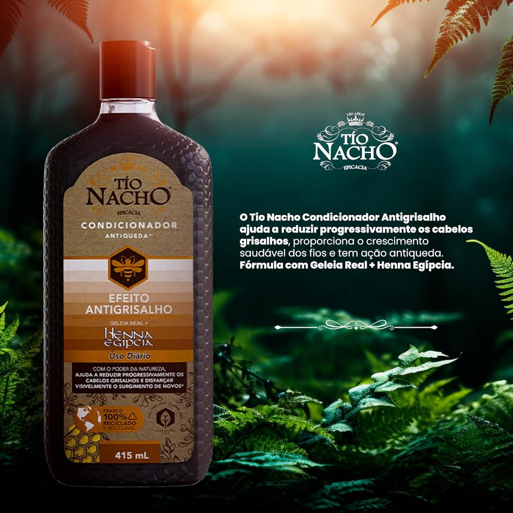 Condicionador Tío Nacho Efeito Antigrisalho Antiqueda – 415ml O Condicionador Tío Nacho Efeito Antigrisalho Antiqueda foi desenvolvido especialmente para fortalecer os fios, prevenir a queda e ajudar a manter a cor natural dos cabelos por mais tempo. Sua fórmula combina ingredientes naturais e Geleia Real para proporcionar um cuidado completo, deixando os cabelos saudáveis, nutridos e revitalizados. Principais Características - Ação Antigrisalho – Auxilia na manutenção da cor natural dos fios, reduzindo gradualmente o aparecimento de cabelos grisalhos. - Redução da Queda – Fortalece a raiz e os fios, combatendo a queda capilar por quebra. - Nutrição e Brilho – Fórmula com Geleia Real e extratos naturais que hidratam e revitalizam os cabelos. Benefícios - Mantém a cor natural dos fios por mais tempo - Fortalece os cabelos e previne a queda - Deixa os cabelos mais macios, saudáveis e brilhantes - Fórmula suave e dermatologicamente testada Diferenciais do Produto - Enriquecido com Geleia Real e extratos naturais - Livre de amônia e corantes artificiais - Pode ser usado diariamente para um tratamento contínuo Especificações Técnicas - Peso: 415ml Instruções de Uso - Após lavar os cabelos com shampoo, aplique o condicionador nos fios úmidos. - Massageie suavemente, focando nas pontas. - Deixe agir por alguns minutos e enxágue completamente. Avisos e Precauções - Uso externo. - Evite contato com os olhos. Caso ocorra, enxágue com água em abundância. - Não aplique sobre o couro cabeludo irritado ou lesionado. - Mantenha fora do alcance de crianças. O que está incluso? - 1 Condicionador Tío Nacho Efeito Antigrisalho Antiqueda 415ml ---- DÚVIDAS FREQUENTES ---- Os produtos são originais? Sim. Todos os nossos produtos são originais. Emitem nota fiscal? Sim. Emitimos nota fiscal para todos os pedidos.