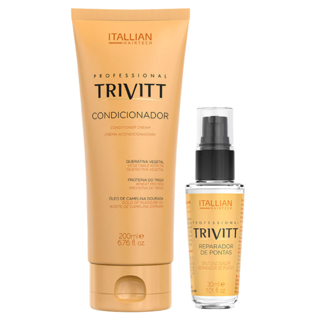 CONDICIONADOR TRIVITT 200ML Proporciona fios macios e condicionamento com hidratação. A composição do Condicionador Trivitt repara as partes danificadas dos fios ao mesmo tempo em que devolve a hidratação e a elasticidade e forma um filme que controla o frizz, reduz o volume e protege do ressecamento. Ativos: Por ser quaternizada (carregada positivamente), apresenta alta substantividade, ou seja, adere-se com facilidade à fibra capilar (a carga positiva da proteína é atraída pela carga negativa do cabelo muito danificado). Possui grupos derivados do coco ligados à sua estrutura. Confere brilho Melhora a penteabilidade à úmido e à seco. Mantém os fios maleáveis. É altamente condicionante. Queratina: os cabelos são constituídos principalmente por essa proteína, composta por uma sequência de 18 aminoácidos interligados por pontes de hidrogênio, dissulfeto (enxofre) e salinas. Como é hidrolisada, apresenta baixo peso molecular, o que facilita sua penetração através das cutículas. Deposita-se sobre as regiões que apresentam danos, restaurando os fios. Reequilibra o teor de água e a distribuição de cargas elétricas da fibra capilar. Após penetrar através das cutículas, mantém as mesmas seladas (pH adequado para o fechamento das escamas). Óleo de Cana Dourada: ingrediente de origem 100% vegetal, obtido da planta “Gold of Pleasure” (Cana sativa). Fornece a proporção ideal de Ômegas 3 e 6 para restaurar o teor lipídico (oleosidade natural) da fibra capilar. Combate o toque áspero dos cabelos ressecados e fragilizados. Recupera a elasticidade e flexibilidade dos fios. Modo de Uso: Após lavar os cabelos com shampoo, aplique o condicionador do comprimento às pontas. Deixe agir por 1-2 minutos e enxágue. Precauções: Uso externo Não usar em crianças Mantenha fora do alcance de crianças Prazo de Validade: 36 meses. REPARADOR DE PONTAS TRIVITT 30ML Trivitt Reparador de Pontas é um reparador de pontas para todos os tipos de cabelo. Recupera o brilho, repara as pontas duplas e condiciona os fios. A tecnologia com silicones forma uma película que protege o cabelo e deixa os fios macios e com brilho luminoso sem que eles fiquem pesados ou oleosos. Ativos: Blend de Silicones: Combinação de silicones com texturas diferenciadas e alta tecnologia. Forma um filme protetor, que previne e repara pontas duplas Oferece condicionamento superior Proporciona aos cabelos sensorial sedoso e macio Confere brilho tridimensional Possui toque aveludado e não oleoso Filtro Solar: Absorve de forma eficiente a radiação UV-B. Protege os fios contra os danos provocados pela radiação UV-B É resistente à água Modo de Uso: Espalhe algumas gotas do Reparador de Pontas Trivitt sobre a palma das mãos e aplique nos cabelos, concentrando nas pontas. Precauções: Uso externo Mantenha fora do alcance de crianças Prazo de Validade: 36 meses.