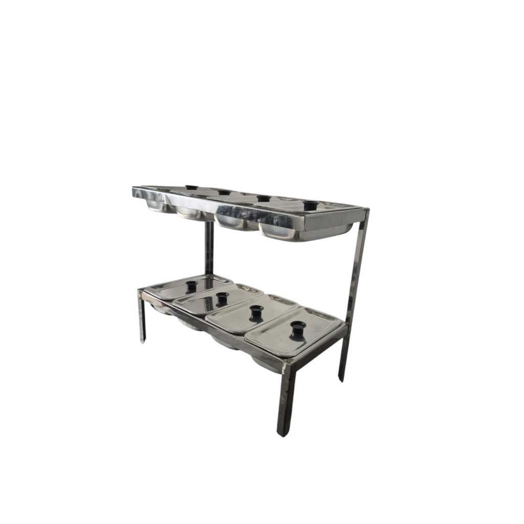 Organize seus ingredientes com praticidade e higiene! Esta condimentadora de alimentos em inox é ideal para restaurantes, lanchonetes, pizzarias, buffets e cozinhas profissionais que buscam eficiência e apresentação impecável. Características do produto: 🍽️ Dois andares com 4 cubas em cada nível (total de 8 cubas); 🧊 Capacidade individual: 1 litro por cuba; 🔒 Tampas individuais para cada compartimento, garantindo maior higiene e conservação dos alimentos; 🧼 Fabricada em aço inoxidável de alta qualidade, resistente à corrosão e fácil de limpar; ⚙️ Estrutura firme e estável, ideal para uso intensivo em ambientes profissionais; 💡 Design moderno e funcional, otimizando o espaço de trabalho Perfeita para armazenar molhos, condimentos, toppings, legumes, frios e ingredientes variados, mantendo tudo sempre organizado e pronto para o preparo.