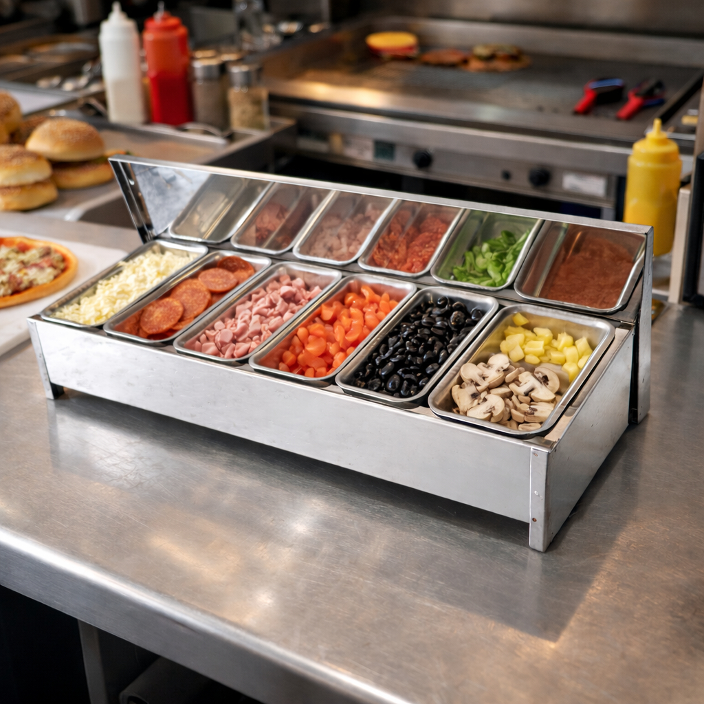 Condimentadora De Inox 6 Cubas Pizzarola Profissional Para Mesa Bancada
