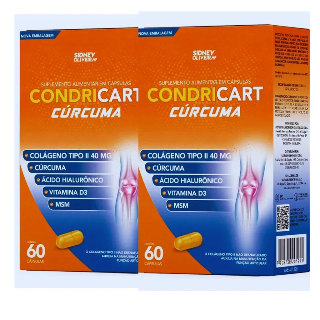 Condricart Cúrcuma 60 Cápsulas Sidney Oliveira Condricart Curcuma é um suplemento alimentar composto por Colágeno tipo II, Cúrcuma, Ácido Hialurônico, MSM (Metilsulfonilmetano) e Vitamina D3, nutrientes importantes para a saúde dos ossos e articulações. - A vitamina D3 auxilia na formação de ossos e dentes, na absorção de cálcio e fósforo e no funcionamento do sistema imune; - Contém 40 mg de Colágeno tipo II não hidrolisado; - O Colágeno tipo II não hidrolisado auxilia na função articular; - Rápida absorção. Recomendações de uso: Ingerir 2 cápsulas ao dia. Informação nutricional: Porções por embalagem: 30 – Porção: 1,1 g (2 cápsulas) – Vitamina D3 (mcg): 50 (333%VD*); Metilsulfonilmetano (mg): 200 . Colágeno tipo II (mg)**: 1,6 ; Ácido Hialurônico (mg): 12 ; curcumina (mg): 80 . Não contém quantidades significativas de Valor energético, Carboidratos, Açúcares Totais, Açúcares adicionados, Proteínas, Gorduras Totais, Gordura Saturadas, Gordura Trans, Fibras alimentar e Sódio. * Percentual de Valores diários fornecidos pela porção. Precauções: Produto indicado para maiores de 19 anos. Este produto não é um medicamento. Não exceder a recomendação diária de consumo indicada na embalagem. Mantenha fora do alcance de crianças. Este produto não deve ser consumido por gestantes, lactantes e crianças. Conservação: Conservar o produto fechado, em local fresco e ao abrigo de luz. Após abertura da embalagem, consumir em até 80 dias.