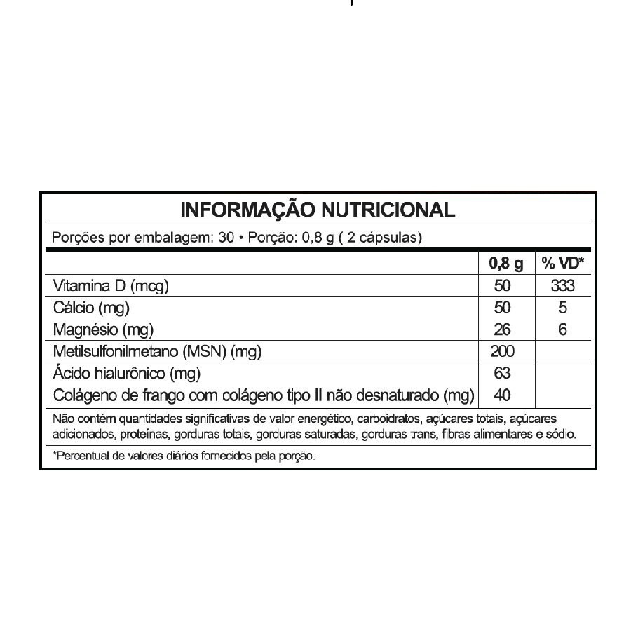 Condricart Ultra Power Sidney Oliveira 60 cápsulas Original Condricart Ultra Power é um suplemento alimentar com Colágeno tipo II 40mg, Ácido hialurônico, Enxofre orgânico (MSM), Magnésio, Cálcio e Vitamina D3 em cápsulas. - Colágeno tipo II não desnaturado auxilia na manutenção da função articular; - Preço mais acessível comparado a concorrente; - A vitamina D auxilia no funcionamento do sistema imune; -O Cálcio auxilia na coagulação do sangue; -O Magnésio auxilia no metabolismo energético. Recomendações de uso: Ingerir 2 cápsulas ao dia. Informação nutricional: Porções por embalagem: 30; - Porção: 0,8 g (2 cápsulas) – Por (0,8 g, %VD*); Vitamina D (50 mcg, 333%); Cálcio (50 mg, 5%); Magnésio (26 mg, 6%); Metilsulfonilmetano (MSN) 200 mg; Ácido hialurônico 63 mg; Colágeno de frango com colágeno tipo II não desnaturado 40 mg. Não contém quantidades significativas de valor energético, carboidratos, açúcares totais, açúcares adicionados, proteínas, gorduras totais, gorduras saturadas, gorduras trans, fibras alimentares e sódio. * Percentual de valores diários fornecidos pela porção. Composição: MSM (Metilsulfonilmetano), cálcio (carbonato de cálcio), Ácido hialurônico (hialuronato de sódio), magnésio (óxido de magnésio), Colágeno de frango com colágeno tipo II não desnaturado, vitamina D3 (colecalciferol) e estabilizante celulose microcristalina. Cápsula: gelatina e corante dióxido de titânio. NÃO CONTÉM GLÚTEN. Precauções: Produto indicado para o grupo populacional ≥ 19 anos. Este produto não é um medicamento. Não exceder a recomendação diária de consumo indicada na embalagem. Mantenha fora do alcance das crianças. Este produto não deve ser consumido por gestantes, lactantes e crianças. Conservação: Manter ao abrigo da luz, calor e umidade. Guarde em local fresco e seco (15 a 30 graus). Esta embalagem foi selada para sua proteção. Não utilize o produto em caso de violação. Restrições: Em caso de hipersensibilidade (alergia) a algum dos componentes da fórmula.