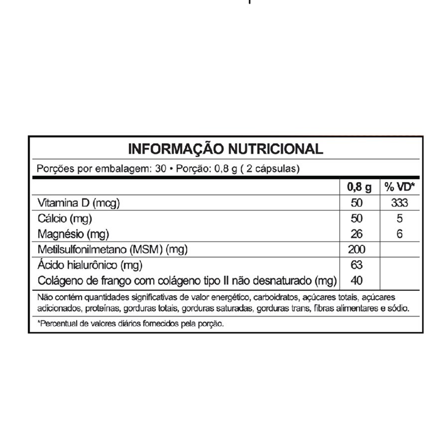 Condricart Ultra Power Sidney Oliveira 60 cápsulas Condricart Ultra Power é um suplemento alimentar com Colágeno tipo II 40mg, Ácido hialurônico, Enxofre orgânico (MSM), Magnésio, Cálcio e Vitamina D3 em cápsulas. - Colágeno tipo II não desnaturado auxilia na manutenção da função articular; - Preço mais acessível comparado a concorrência; - A vitamina D auxilia no funcionamento do sistema imune; - O Cálcio auxilia na coagulação do sangue; - O Magnésio auxilia no metabolismo energético. Recomendações de uso: Ingerir 2 cápsulas ao dia. Informação nutricional: Porções por embalagem: 30; - Porção: 0,8 g (2 cápsulas) – Por (0,8 g, %VD*); Vitamina D (50 mcg, 333%); Cálcio (50 mg, 5%); Magnésio (26 mg, 6%); Metilsulfonilmetano (MSN) 200 mg; Ácido hialurônico 63 mg; Colágeno de frango com colágeno tipo II não desnaturado 40 mg. Não contém quantidades significativas de valor energético, carboidratos, açúcares totais, açúcares adicionados, proteínas, gorduras totais, gorduras saturadas, gorduras trans, fibras alimentares e sódio. * Percentual de valores diários fornecidos pela porção. Composição: MSM (Metilsulfonilmetano), cálcio (carbonato de cálcio), Ácido hialurônico (hialuronato de sódio), magnésio (óxido de magnésio), Colágeno de frango com colágeno tipo II não desnaturado, vitamina D3 (colecalciferol) e estabilizante celulose microcristalina. Cápsula: gelatina e corante dióxido de titânio. NÃO CONTÉM GLÚTEN. Precauções: Produto indicado para o grupo populacional = 19 anos. Este produto não é um medicamento. Não exceder a recomendação diária de consumo indicada na embalagem. Mantenha fora do alcance das crianças. Este produto não deve ser consumido por gestantes, lactantes e crianças. Conservação: Manter ao abrigo da luz, calor e umidade. Guarde em local fresco e seco (15 a 30 graus). Esta embalagem foi selada para sua proteção. Não utilize o produto em caso de violação. Restrições: Em caso de hipersensibilidade (alergia) a algum dos componentes da fórmula.