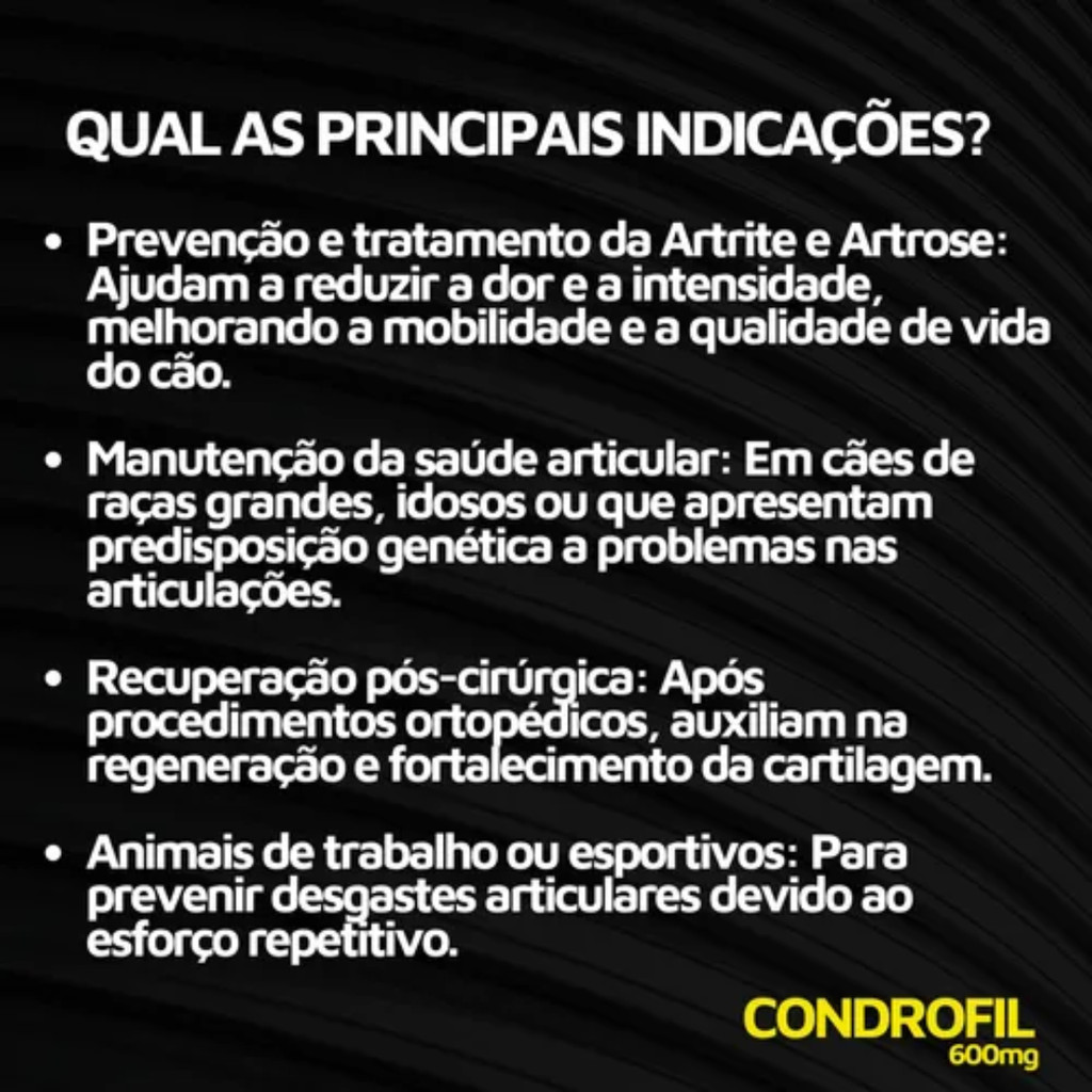 CONDROFIL - CONDROPROTETOR / REPARO DAS ARTICULAÇÕES / SUPORTE ARTICULAR Melhore a Qualidade de Vida do Seu Cão com Nosso Condroprotetor Premium! Seu melhor amigo merece o melhor cuidado! Apresentamos nosso suplemento avançado de condroitina e glucosamina, especialmente formulado para a prevenção e tratamento da artrite e artrose. Com ingredientes poderosos, nosso produto é ideal para: Alívio de Dor e Melhoria da Mobilidade: Reduza a intensidade da dor e melhore a mobilidade do seu cão, proporcionando mais qualidade de vida. Saúde Articular em Cães Idosos e de Raças Grandes: Perfeito para cães que precisam de suporte adicional nas articulações, especialmente aqueles com predisposição genética a problemas articulares. Recuperação Pós-Cirúrgica: Auxilia na regeneração e fortalecimento da cartilagem após procedimentos ortopédicos. Fortalecimento Ósseo: Com colágeno, ajuda a fortalecer os ossos, crucial para cães mais velhos ou com histórico de problemas ósseos. Recuperação de Lesões: Ideal para a regeneração de ligamentos, tendões e cartilagens, ajudando seu amigo a voltar à sua rotina ativa mais rápido. Composição Riquíssima: Ácido Cítrico: 990 mg/kg Cálcio: 4,9 g/kg Cúrcuma: 1.920 mg/kg (propriedades anti-inflamatórias) Condroitina: 198 g/kg Glucosamina: 312 g/kg E muito mais! Indicações: - Cães obesos - Cães idosos - Cães Atletas - Raças com problemas crônicos nas Articulações - Articulações e cartilagens - Inflamações Diferenciais: Com a cúrcuma e magnésio em sua fórmula, nosso suplemento combate a inflamação de forma eficaz, sendo uma excelente opção para cães com artrite e dores articulares. Dosagem Prática: Cada comprimido é eficaz para cães de até 10 kg, facilitando a administração e garantindo que seu cão receba a dose adequada para suas necessidades. Apresentação: Cartucho com 30 Comprimidos. Dê ao seu cão o suporte que ele precisa para se manter ativo e feliz!