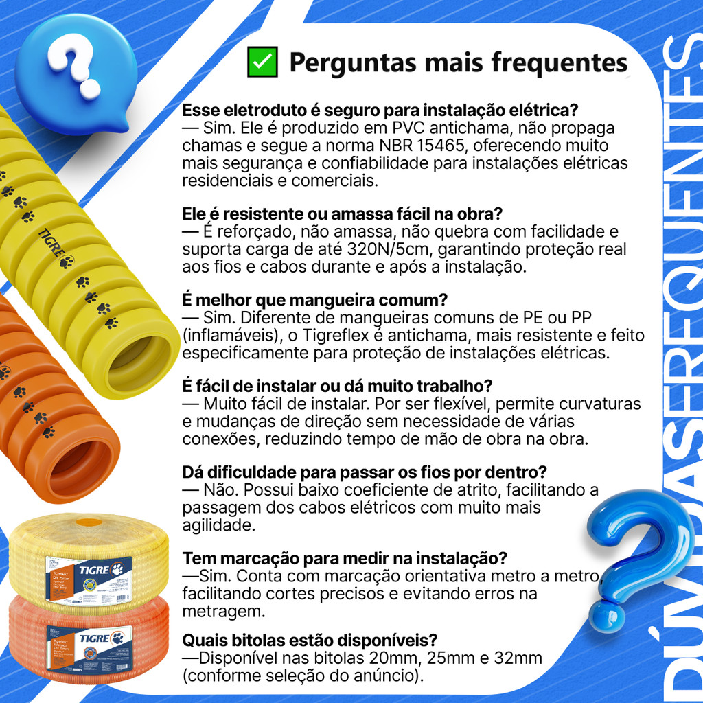 Eletroduto Conduíte em PVC Antichama – Segurança e Organização para Instalações Elétricas Mais segurança e proteção na hora de manusear a peça e realizar instalações elétricas embutidas em paredes. Desenvolvido para oferecer resistência, praticidade e confiabilidade, o eletroduto em PVC é ideal para condução e proteção de fios e cabos com alto padrão de qualidade. Mais Segurança e Proteção para Instalações Elétricas Além de resistente, é um produto seguro. Fabricado em PVC antichama e conforme a norma NBR 15465, não propaga chamas, não sofre corrosão, não quebra e não amassa, garantindo maior durabilidade e proteção para a instalação elétrica. Solução Rápida e Discreta para Organizar Fios e Cabos Ideal para organizar e finalizar a parte elétrica da residência ou obra com rapidez e eficiência. A bobina do rolo pode ser facilmente desenrolada, não dá nó e possui marcação orientativa metro a metro, facilitando o corte, o manuseio e a instalação. Características do Produto: • Fabricado em PVC antichama • Cor: Amarela • Não propaga chamas • Não sofre corrosão • Não quebra e não amassa • Corrugação paralela para maior resistência • Marcação orientativa por metro na bobina • Baixo coeficiente de atrito para facilitar a passagem dos cabos • Geometria flexível que permite curvaturas sem conexões Bitolas Disponíveis: • 20 mm • 25 mm • 32 mm Resistência e Durabilidade: • Resistência diametral: até 320N/5cm • Alta resistência química e contra corrosão • Ideal para regiões litorâneas e ambientes agressivos • Produto leve, durável e de fácil estocagem Facilidade de Instalação: • Pode ser curvado para mudanças de direção sem conexões • Estrutura leve que facilita o manuseio na obra • Bobinas em grandes comprimentos, reduzindo emendas • Facilita a introdução e passagem dos cabos elétricos Economia na Obra: • Reduz custos de mão de obra • Diminui o tempo de execução das instalações • Dispensa conexões em muitos trajetos • Fornecido em bobinas que otimizam o uso Aplicações Indicadas: Ideal para instalações elétricas embutidas em paredes, condução e proteção de fios e cabos elétricos em residências, comércios e obras em geral, garantindo organização, segurança e acabamento profissional conforme a NBR 15465.