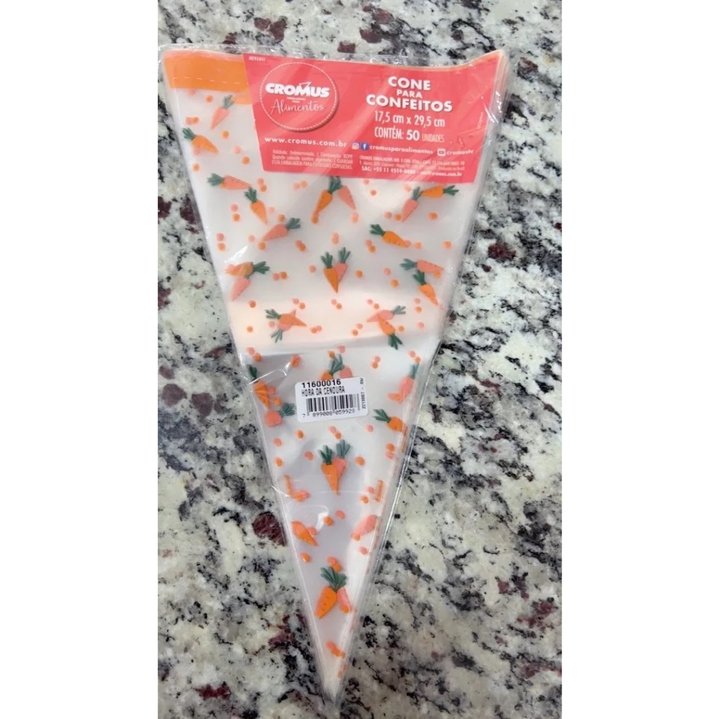 Cone Festa Hora da Cenoura - 18x30cm - 50 unidades - Cromus - Rizzo Transforme suas celebrações com os Cones Hora da Cenoura da Cromus - Rizzo! Ideais para doces, salgadinhos ou lembrancinhas, esses cones decorados trazem um toque de criatividade e personalização para seus eventos. Amarre uma fita colorida para um charme extra e valorize ainda mais seus produtos e embalagens. Descubra a variedade de estampas encantadoras da linha de Cones Decorados e deixe sua festa ainda mais especial! Descrição Técnica Produto: Cone Modelo: Hora da Cenoura Composição: Poli Transparente. Tamanho: 18x30cm EAN: 7898546485039 Quantidade: 50 unidades Marca: Cromus Páscoa Dúvidas Frequentes: Quanto tempo leva o envio? ⏰ Todos os pedidos com etiqueta de envio liberado pela shopee até as 18hs são coletados no próximo dia útil pela transportadora Shopee Express. Qual o prazo de entrega? 🛵 A loja não tem acesso a parte logística da shopee. A Shopee não informa para a loja prazo de entrega. Ao clicar em comprar na opção envios é apresentado o prazo de entrega. O produto é novo? 😀 Sim. Só trabalhamos com produto novos e dentro da embalagem original do fabricante. Como faço para comprar mais de um item da loja? 🛍 No app ao lado do botão comprar tem o ícone de um carrinho de supermercado, clicando nele o produto será acrescentado no carrinho que fica na parte superior do app. Após acrescentar todos os produtos que gostaria é só clicar no carrinho e selecionar todos os itens e clicar em continuar. Comemore com Alegria: 🥰😀 Na Rizzo Distribuidora, a tradição e o encanto do nosso espaço físico no coração da 25 de março, em São Paulo, são cuidadosamente embalados para chegar até você. Permita-nos levar a magia de uma das lojas mais tradicionais da região diretamente para o conforto da sua casa ou empresa.