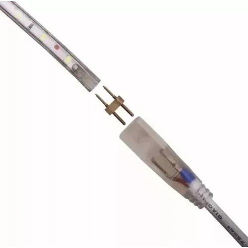 Conector Plug Tomada para Mangueira LED achatada compatível com o modelo 5050 de 02 fios (cor única). Voltagem: Bivolt 110v/220v Acompanha agulha "H" para conexão com a mangueira. *Pode ser usado para ligar até 100 metros contínuos de Mangueira LED com um único conector. Especificação técnica: - Contém resistor interno para filtrar a linha e dar estabilidade na ligação e aumentar a vida útil dos LEDs em ate 30%. - Este modelo é indicado para mangueira luminosa de LED 5050 chata de 02 fios! - Uso interno, não pode tomar chuva. Para uso externo, recomendamos envolver o conector com plástico filme e fita isolante, cobrindo toda a área para não entrar umidade. *** NÃO É COMPATÍVEL COM MANGUEIRA NEON ou MANGUEIRA RGB *** *** NÃO É COMPATÍVEL COM FITA DE LED 12 VOLTS *** Para conectar insira as pontas afiadas da agulha na mangueira de forma a coincidir as pontas com os fios que atravessam a mangueira e insira o outro lado no conector. Lembre-se que LED tem polaridade. Se não acender, inverta a ligação desligando o conector, virando 180° e religando ou revise se a agulha está conectada aos fios da mangueira. Para maiores referencias, veja as fotos acima.