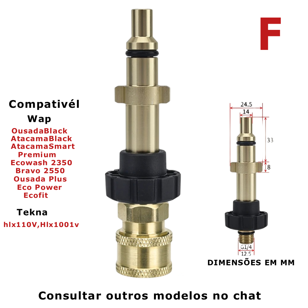 Aviso Importante APENAS ADAPTADOR, NÃO ACOMPANHA BICOS. Certifique-se de escolher o adaptador correto para sua lavadora de pressão. Caso tenha dúvidas, envie uma foto da sua máquina e ajudaremos a selecionar o modelo adequado. Compatibilidades por Letra Letra A – Karcher - K2 - K3 - K4 - K5 - K6 - K7 Letra B – Makita / Bosch / Wap / Black+Decker - Makita: HW101, HW102, HW132 - Bosch: GHP-180, GHP-200, GHP-220, GHP-4-50 - Wap: WL1800 - Black+Decker - Philco: PLP2600 Letra C – Diversos Modelos - Wap: Ousada WL, Combate Turbo WL1820, WL4000, WL2660, Extreme Turbo - Vonder - BlackTools - Toyama - Kala - Intech Machine - Tramontina Master - Tekna: HLX1501V, HLX1502V - Philco: PLA3100, PLP2800, PLP2300, PLP2200, PLA2500, PLAS4000 Letra D – Stihl - RE88–RE98 - RE108 Letra E – Wap / Karcher / Philco - Wap: Lider, PowerWash, NewEcoWash, Premier 2600, Ágil 1800 - Karcher: Prática Black, Compacta Letra F – Wap / Tekna - Wap: Ousada Black, Atacama Black, Atacama Smart, Premium, Ecowash 2350, Bravo 2550, Ousada Plus, Eco Power, Ecofit - Tekna: HLX110V, HLX1001V Letra I – Karcher - HD585 (modelo antigo) LETRA J - KARCHER - Karcher HD Easy!Lock EasyForce