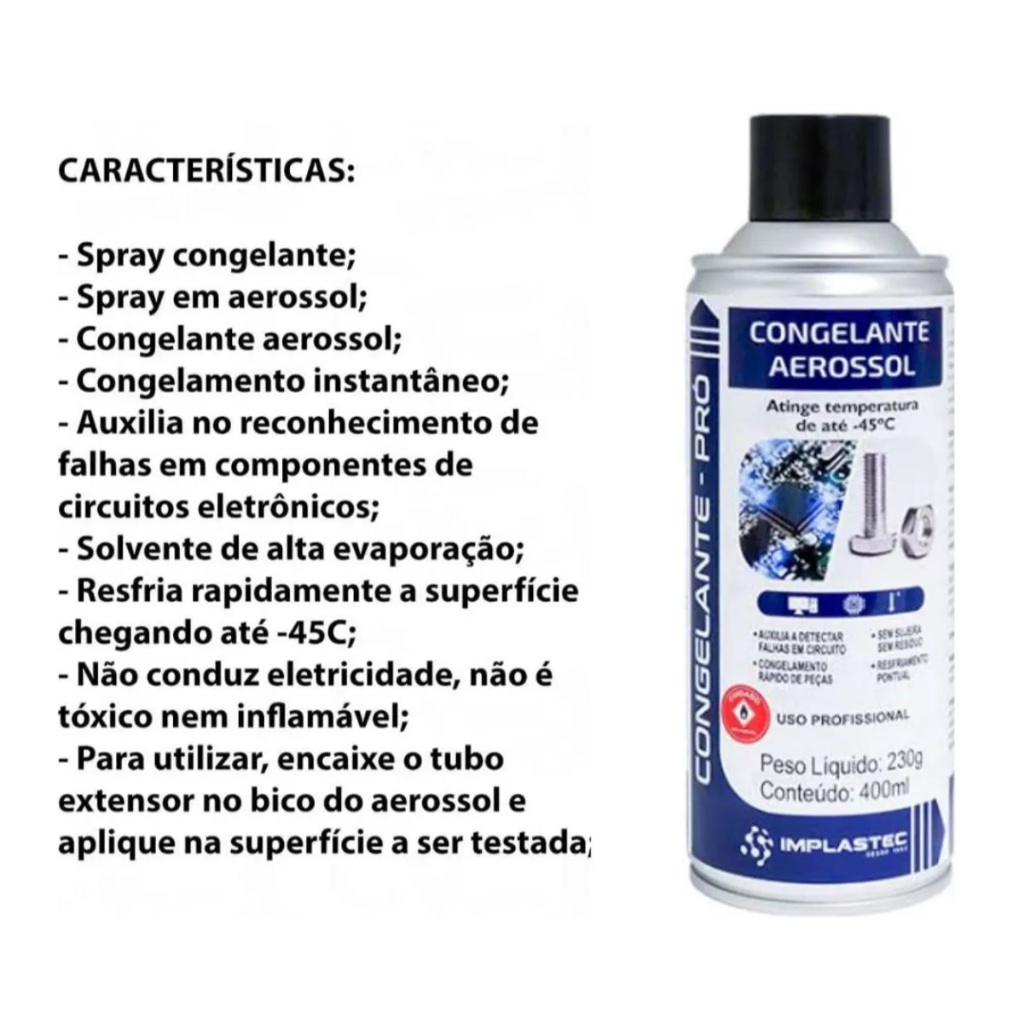 - PRODUTO NOVO COM NOTA FISCAL O Congelante Pró Implastec é um produto de uso profissional que pode atingir uma temperatura de até -45C no local em que for aplicado, auxiliando na detecção de falhas em componentes eletrônicos, podendo ser utilizado no congelamento rápido ou resfriamento pontual de peças, na montagem de pequenos rolamentos e/ou engrenagens em eixos resfriados, auxilia na montagem e desmontagem de peças devido a contração do metal. Principais Aplicações O Congelante Pró Implastec é indicado para o resfriamento rápido ou pontual de peças, montagens de pequenos rolamentos, e/ou engrenagens em eixos resfriados, auxiliando na detecção de falhas em componentes eletrônicos. Transporte e Armazenagem Armazenar o produto vedado, longe do calor, em local seco, ao abrigo da luz, bem ventilado e em temperatura ambiente. Mantenha o produto em sua embalagem original. Não reutilizar a embalagem vazia. Não guardar no interior de veículos. Manuseio e Método de Aplicação Com o equipamento desenergizado, segure a lata na vertical, aplique na área desejada a uma distância de 15cm em intervalos curtos. Dispensa limpeza posterior ao uso, pois não deixa resíduos. Antes de utilizar o Congelante Pró, leia atentamente todas as orientações contidas neste rótulo. As aplicações aqui descritas são sugestões, devendo realizar um teste, a fim de verificar se o mesmo possui as propriedades requeridas pelo usuário. Observações As informações e dados contidos neste boletim correspondem aos nossos conhecimentos atuais coligidos por pessoal técnico capacitado e confiável. Devem ser tomados como orientação e não como especificação garantida. Em qualquer caso de uso, o cliente deverá testar o desempenho contando com informações que possamos fornecer. Indicações de uso não são sugestões para se infringir patente ou legislação. Uma vez que não temos controle sobre o uso por terceiros, nossa responsabilidade se limita apenas ao nosso produto.