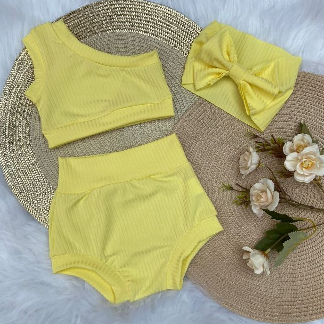 CONJ. INFANTIL BEBÊ - 3 PEÇAS: TAPA FRALDA+BLUSA+TIARA. Short Bebê - Canelada c/ elastano.
