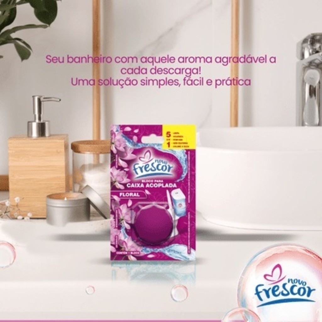 SE ATENTEM AS VARIAÇÕES - 3 UNIDADES OU 10 UNIDADES Os agentes de espuma e limpeza do Tablete para Caixa Acoplada Novo Frescor liberam um agradável Frescor, descarga após descarga, por algumas semanas. Use regularmente para manter seu vaso sanitário limpo e brilhante. É muito fácil de usar. Basta inserir o tablete dentro da caixa acoplada, e ele vai se dissolvendo aos poucos, sem que você precise tocar no vaso sanitário. Assim que a água não estiver saindo colorida, é hora de colocar outro nBovo em sua caixa acoplada. - O Limpador Sanitário em Tablete para Caixa Acoplada Novo Frescor é especialmente indicado para a limpeza completa do seu vaso sanitário começando pela caixa acoplada e chegando até as paredes do vaso sanitário. - INSTRUÇÕES DE USO: 1 - Retire o tablete da embalagem plástica. 2 - Abra a tampa da caixa acoplada, em seguida insira o tablete Novo Frescor posicionando o produto longe da saída de água. 3 - Recoloque a tampa da caixa acoplada e aguarde 10 minutos para acionar a descarga. 4 - Quando a coloração da água diminuir, coloque outro Tablete para Caixa Acoplada Novo Frescor. - Precauções e Segurança: Conserve fora do alcance das crianças e dos animais domésticos. Não expor o produto ao sol e calor acima de 35ºc. Não reutilizar a embalagem vazia. Lavar as mãos após o manuseio do produto. Em caso de contato com os olhos, lavar com água em abundância. Em caso de ingestão, não provocar vômito e consultar imediatamente o centro de intoxicações ou serviço de saúde mais próximo levando a embalagem vazia. Nunca reutilizar a embalagem vazia. * Conteúdo: Kit 10 Ou 3 Unidades de 45g cada. * Fabricante: Novo Frescor