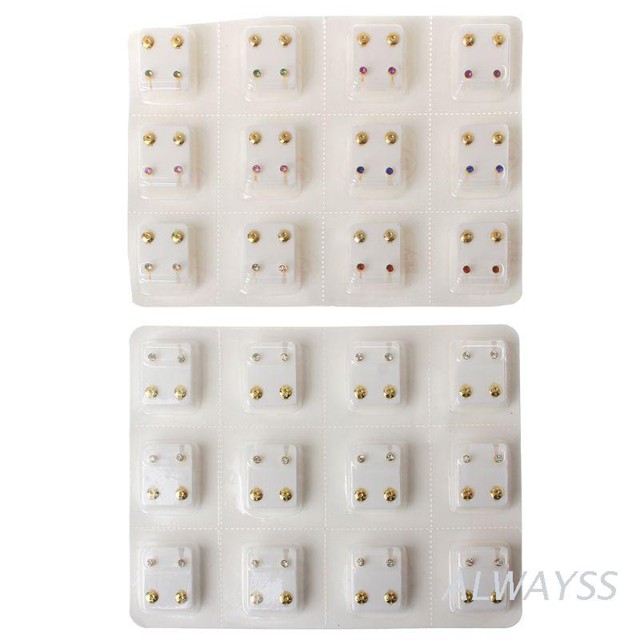 Descrição do produto inglês após português 12 Pares Jogo Brincos Piercing Ouro Ouro Hipoalergênico 3mm CZ CZ Studs Joias Característica Lacrado, Esterilize Blister. Facilmente retirado cartucho para uso orelhas já perfuradas. Vem Brincos Borboletas, são postos atrito suspensos para fixação segura fácil usar você está perfurando-se pessoa para dormir Os brincos estão uma unidade pronta para para furar seus ouvidos junto a dor manche deixar aquele resíduo esverdeado Cobre Cristais Cor: Branco & Multi-Colors