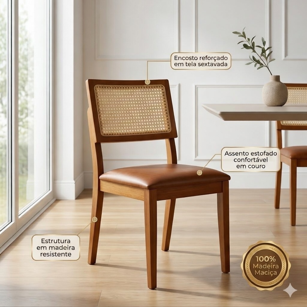 🪑 Kit 2 Cadeiras de Jantar Madeira Maciça Premiere com Estofado Couríssimo A cadeira de jantar é muito mais do que um simples assento: ela reflete estilo, sofisticação e aconchego ao ambiente. Com o Kit 2 Cadeiras de Jantar Madeira Maciça Premiere com Estofado Couríssimo, sua sala de jantar se transforma em um espaço de elegância e conforto duradouro. Ideal para quem busca design clássico aliado ao moderno, essas cadeiras unem qualidade, resistência e acabamento impecável. 🌳 Qualidade e Durabilidade em Madeira Maciça Se você procura móveis robustos e resistentes ao tempo, a madeira maciça é a escolha perfeita! Diferente do MDF, que pode se desgastar ou deformar, a madeira maciça garante longevidade e alta performance. São cadeiras que acompanham sua família por décadas, mantendo estrutura e beleza intactas. 🪑 Design Ergonômico e Confortável - Encosto em Tela Sextavada – além de moderno, garante firmeza e conforto para as costas. - Assento Estofado em Couríssimo – toque suave, elegante e de fácil limpeza. - Conforto e Sofisticação – perfeito para longas refeições em família ou momentos especiais. 📏 Medidas do Produto: • Altura total: 90 cm • Largura: 45 cm • Profundidade do assento: 43 cm • Altura do assento: 45 cm • Largura do assento: 45 cm 👉 Essas medidas garantem o equilíbrio perfeito entre conforto e praticidade, adaptando-se a diversos espaços e mesas. - Detalhes que Encantam - Acabamento refinado em madeira maciça tratada. - Contraste elegante entre o tom da madeira e o estofado couríssimo. - Estilo versátil: combina com decorações clássicas ou modernas. 🔄 Versatilidade de Uso Embora sejam perfeitas para a sala de jantar, também podem ser usadas em: - Cozinhas - Áreas gourmet - Escritórios - Halls de entrada * Fácil Manutenção e Praticidade ✅ Já vem totalmente montada (sem dor de cabeça). ✅ Limpeza simples: pano seco ou úmido para a madeira e couríssimo higienizado facilmente. Conclusão O Kit 2 Cadeiras de Jantar Madeira Maciça Premiere com Estofado Couríssimo é sinônimo de qualidade, resistência e sofisticação. Perfeito para quem valoriza móveis duradouros e quer transformar qualquer ambiente em um espaço de alto padrão e requinte. ✨ Invista no que há de melhor para sua casa e sinta a diferença de ter móveis de verdade, feitos para durar! 👉 Garanta já o seu kit e leve mais conforto, beleza e durabilidade para o seu lar!