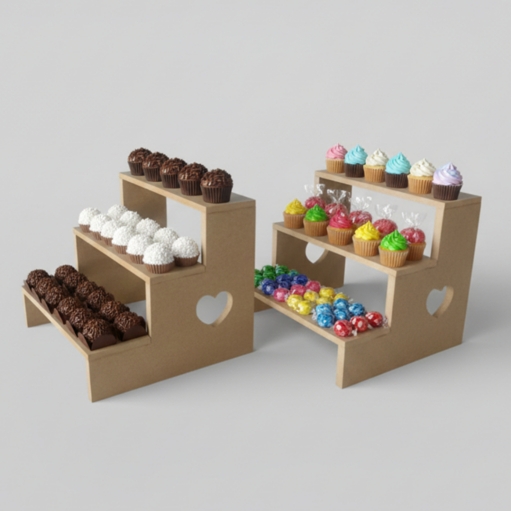 Conjunto 2 Escadinhas Expositoras Para Mesa De Festa MDF 9MM Coração Branco Cru