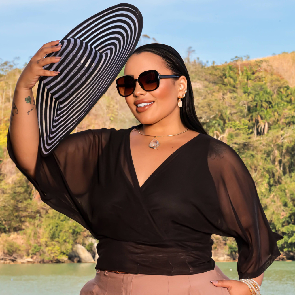❤️Conjunto 2 Peças Blusa Social Feminina Forro + Tule Gola V Manga Curta Sofisticado Tamanho G1