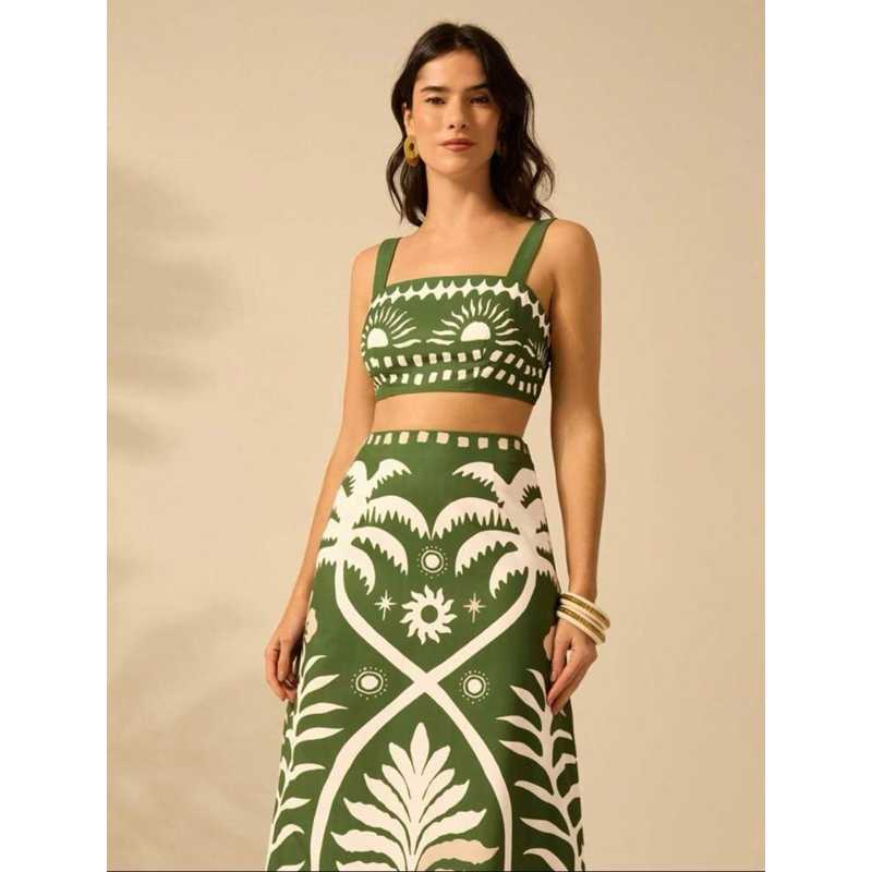 CONJUNTO 2 Peças Conjunto Casual Boho Tropical Composto por Regata Cropped com Estampa de Árvore de Coco e Sol