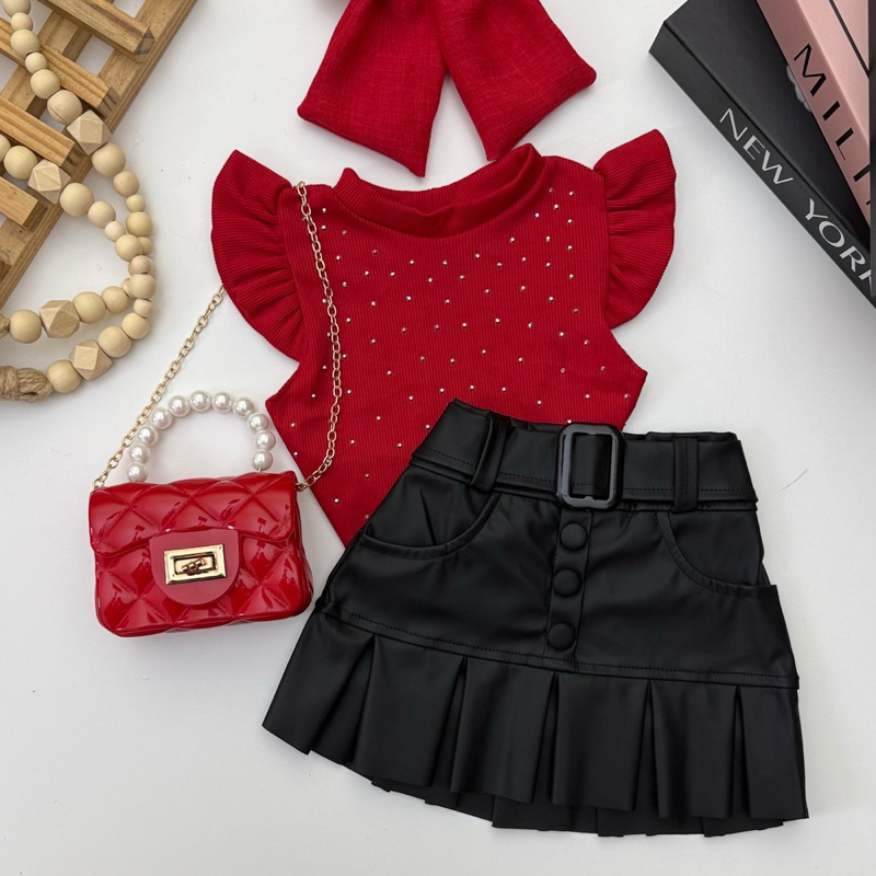 Conjunto 2 Peças Infantil Menina Saia Plissada e Blusa com Brilho Verão Passeio