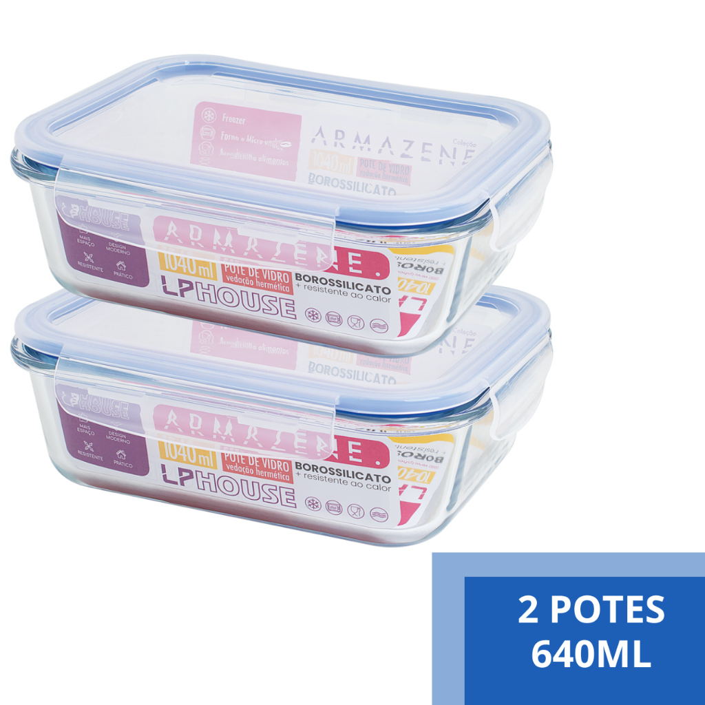 Conjunto 2 Potes 640ml Vidro Hermético 4 Travas Alta Vedação Marmita